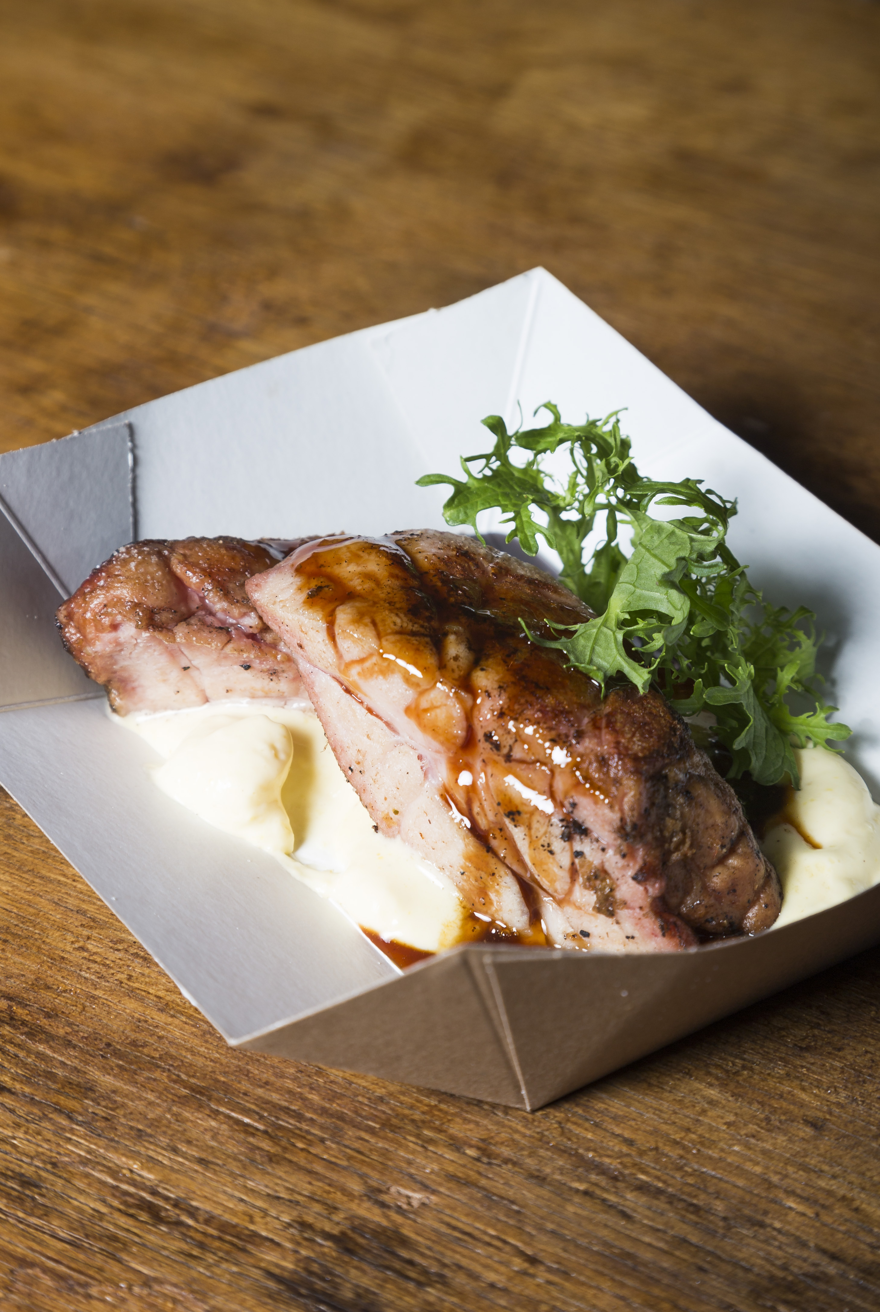 5) LA INTENSA PANCETA BRASEADA CON PURÉ DE MANZANA, HINOJO ENCURTIDO Y MOSTAZA DE PICKLE DE BESTIA (UNO DE LOS PUESTOS CON MÁS ONDA DE LA FERIA)