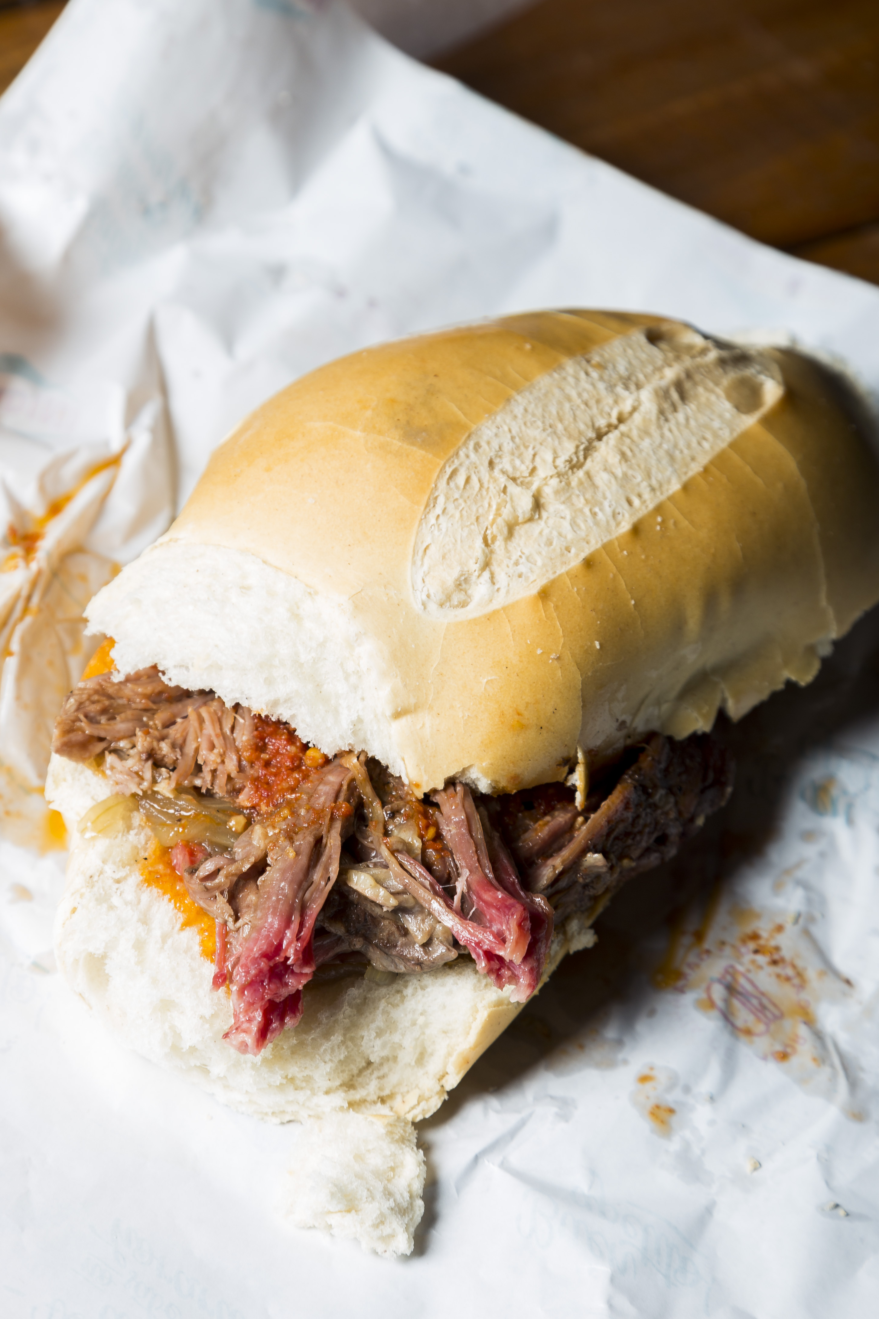 Una verdadera locura de sabor en este sandwich bien power. Si vas con mucho hambre, te conviene empezar por ahí. Si bien la tapa de asado es un corte bastante duro para asar, acá dejan que se cocine en su propio jugo durante ocho horas en un ahumador. El resultado es una carne súper tierna y sabrosa, bastante magra. Las cebollas caramelizadas y el pesto de nueces y tomates secos le dan un toque interesante.