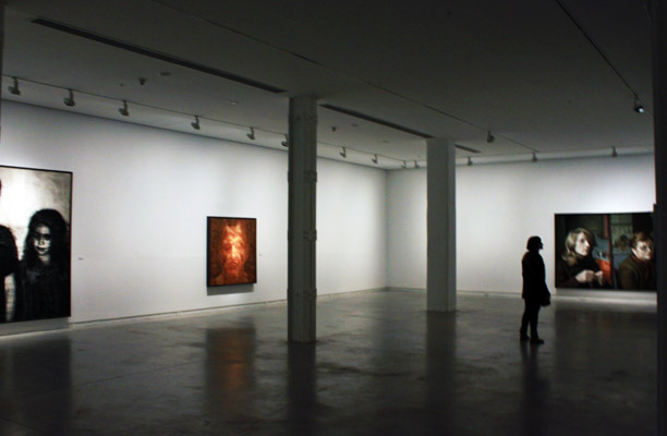 Las obras de la pared que son como vitrinas son muy misteriosas. Todas con puntos de fuga escondido, oscuras ¿A qué hacen referencia?Estas obras son como escapes, puntos de referencia para la vida en algún sentido. Son como anclajes que sentimos que en momentos como estos son necesarios para no sentirse, no sentirnos desvalidos. Entre ellas son todos distintas: algunas con la tecnología, otras con la ciudad, de vuelta con la naturaleza. Todas tienen un asidero real que no es relevante. Por ejemplo, esta está basada en los espacios un poco siniestros de lo religioso.