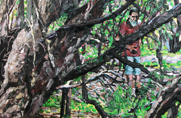Mientras subimos en el ascensor al segundo piso, un ascensor enorme, nos comentan que cada panel que compone la obra Paisaje pesa entre ochenta y cien kilos. “Imaginate subir esos paneles si no hubiéramos tenido este ascensor” dicen. La sala del segundo piso del Museo está ocupada por la obra, hecha con quince de esos paneles, cada uno de tres metros de ancho y dos de alto. Están montados uno detrás de otro dando en una vuelta de casi 360 grados a la sala, iluminados desde arriba. Es un paisaje imponente, inmenso, que empieza con la imagen de unos árboles putrefactos y termina en la orilla de un río.