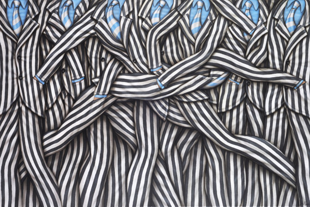 A Ernesto Bertani (64), nuestro artista de la semana, se lo suele definir como un pintor de lo urbano porque su obra refleja el sentir del habitante de las grandes urbes y pone foco en la vestimenta como simbolismo “de una segunda piel”, como se ve en el cuadro que tenemos de fondo. También los conflictos sociales y las indagaciones sobre distintos fenómenos o sentimientos como el amor y la corrupción (de nuevo, el fondo, manos que se meten en bolsillos de otros, sucesivamente) atraviesan como trama su cuerpo pictórico. Nacido en Buenos Aires y con taller en Parque Leloir, es parte de la llamada “Generación del Setenta”.Utiliza el aerógrafo para trabajar sus obras que realiza sobre géneros de tapicería y casimires. Anualmente presenta sus últimas realizaciones. Un dato interesante es que fue autodidacta hasta los 24 años.