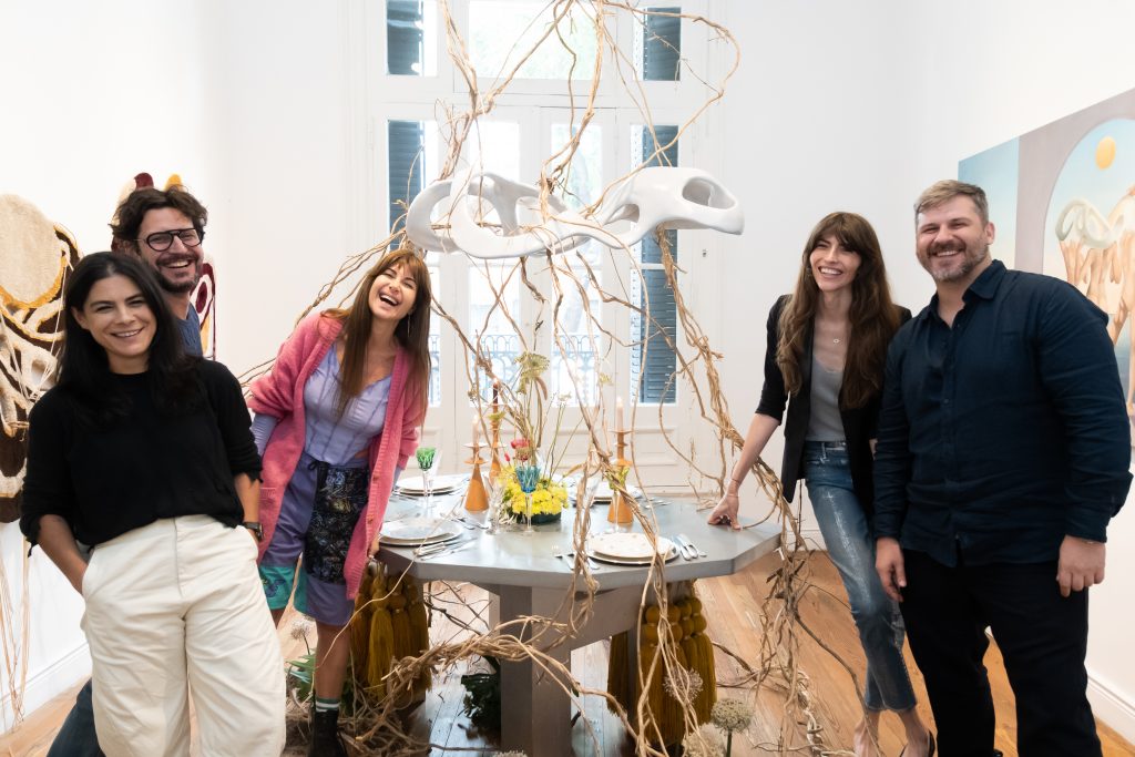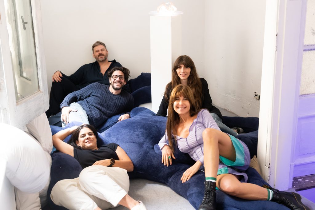 Una casa de pisos azulejados y un patio central. Escaleras, copas y manteles entran y salen a la calle. Una enorme escultura blanda cuelga de las ventanas de un segundo piso, un pasillo en azul y risas que se elevan por los aires junto con conversaciones entre amigos que son socios; personas unidas por el arte. Elemento que amalgama distintos universos. “Venimos todos de mundos muy diversos, lo que hace de esto algo tan desafiante como enriquecedor”, afirmó entre sonrisas el mastermind del proyecto. Uno que surgió en la mente de Pita mientras buscaba una locación para su depósito. En el camino terminó restaurando una antigua casona y alojando un espacio cultural de lo más variado. Esta propuesta tomó vida entre copas con amigos en el bar de Retiro Dadá. Javi se acercó a ellos de uno y les fue proponiendo la idea. Todos, al instante se subieron a la aventura. “Los cinco tenemos backgrounds, personalidades y acercamientos al arte muy diferentes. La diversidad hace todo muy complejo, pero a la vez genera algo muy mega”, confirma Gabriela. “Cuando vibramos y vamos para un mismo lugar somos una topadora” agrega Pita.