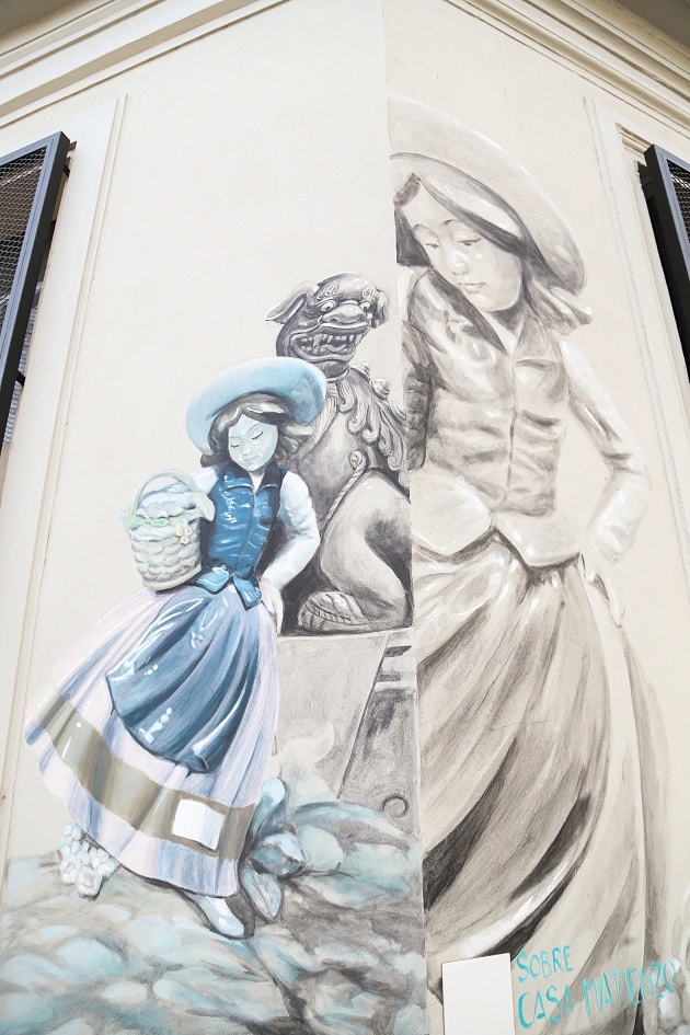 Jose ahora nos guía hacia la esquina de Conde y Matienzo donde nos presenta un mural que por su estilo y las pinceladas que se esfuman no se parece a nada que hayamos visto. Se trata de un trabajo colectivo entre Juan Cuello y Flor Lagos titulado «la piel de los espejos» que me recuerda a las muñequitas de porcelana que se posan sobre los estantes del living de mi abuela. Es que de hecho esa es la intención, ya que el mural está basado en fotos de objetos que se venden en el Mercado de pulgas como una forma de representar parte de la identidad de Colegiales.