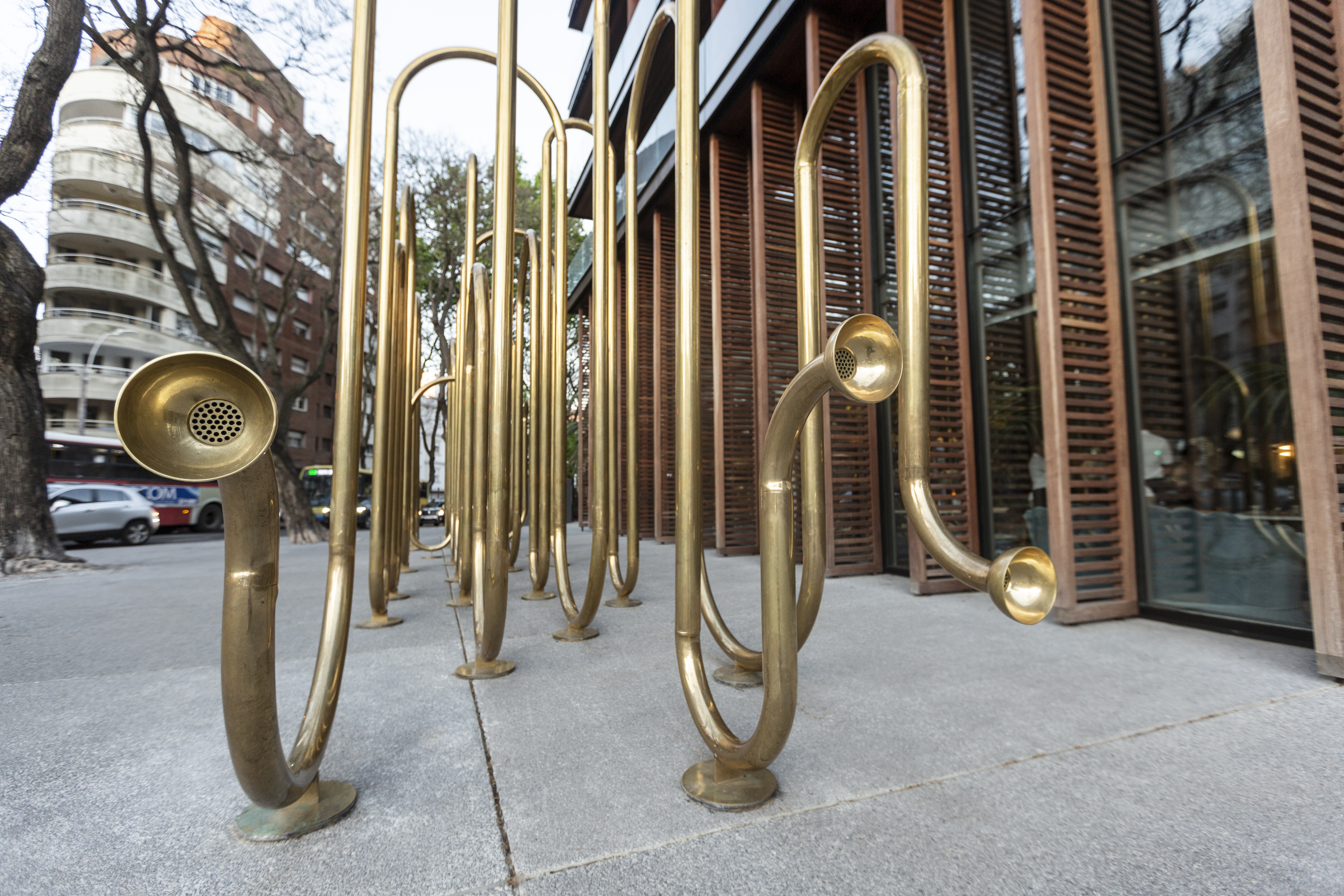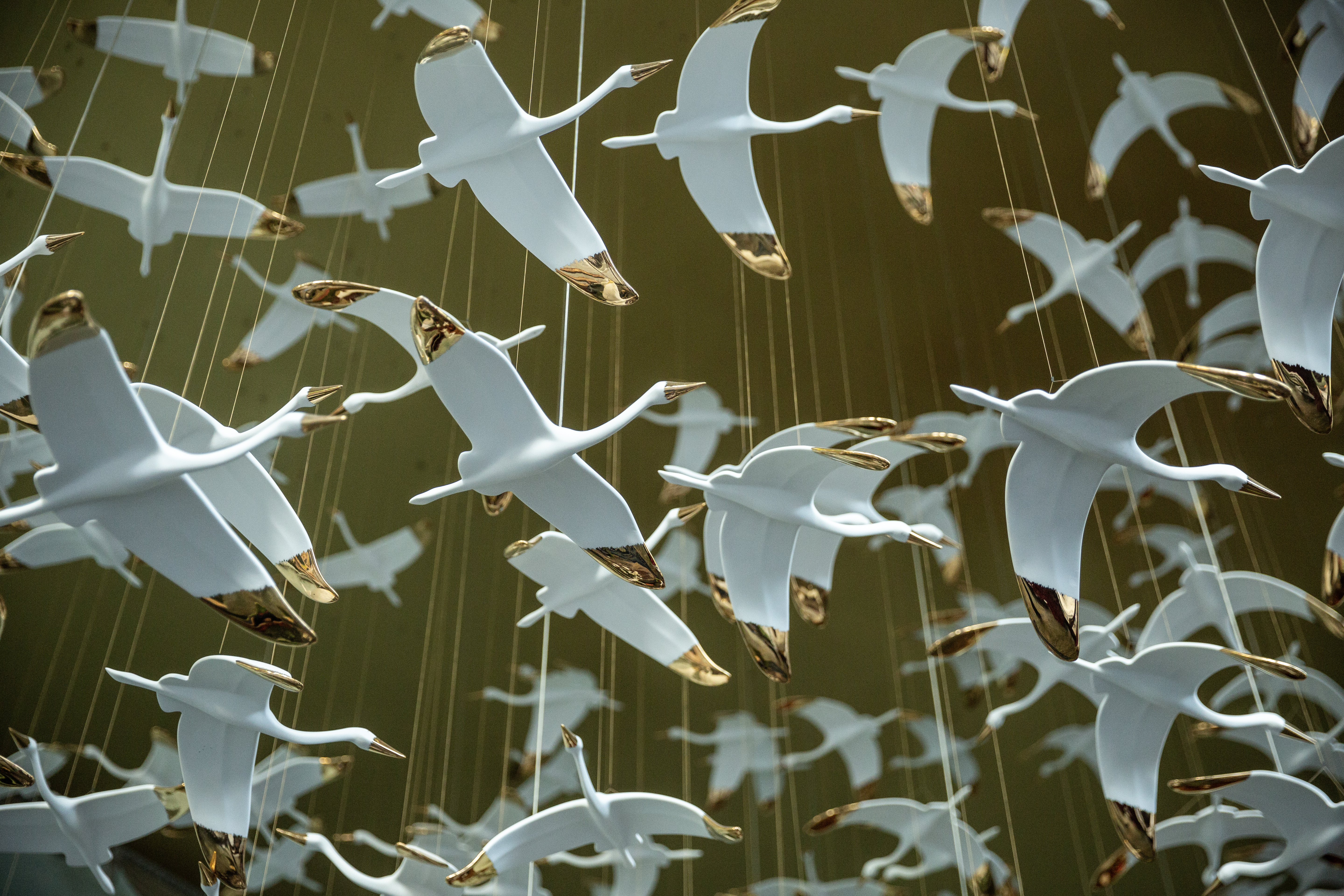 Sobre el lobby se suspenden pájaros de porcelana y oro, obra de la artista alemana Eva Mez, que homenajea a las aves de Uruguay.
