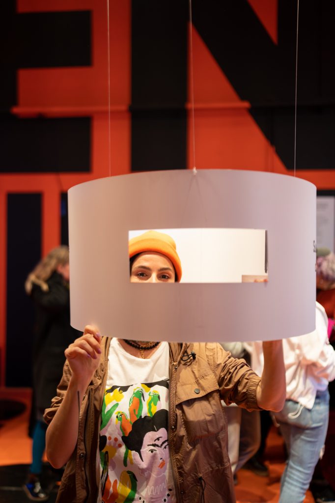 La exhibición está dividida en dos situaciones. Por un lado, podemos ver las distintas obras impresas sobre canvas colgadas en la pared junto al nombre de las autoras. Si seguimos caminando llegamos al centro de la sala, un refugio circular que nos invita a sumergirnos en la historia de las artistas y las obras que inspiraron las piezas exhibidas. El refugio nos muestra en su interior la información en la misma dirección en la que se encuentra la pieza exhibida. De esta manera, se propone un juego: identificar las referencias, el subtexto de cada obra, antes de verificar las fuentes.