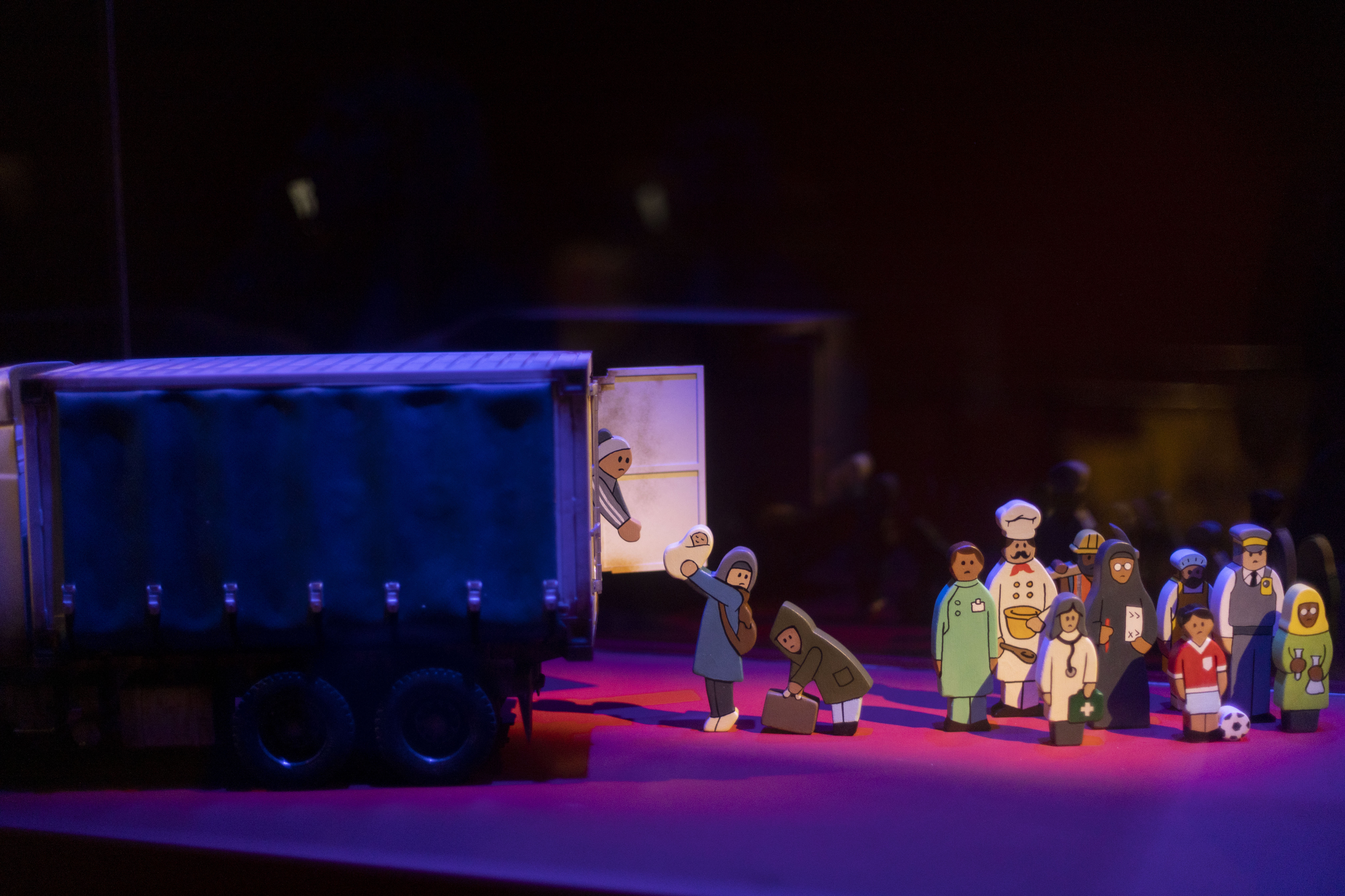 Banksy creó este “juguete” para niños, para aprender a contar; en el grupo escultórico, figuras de madera vestidas de diversas profesiones, observan con lamento a una pareja joven cargando a su hijo en un camión. Estas personas, vestidas con abrigos impermeables, anónimas, ya no tienen ni profesión; la migración devalúa, de algún modo, a las personas ante la sociedad. Por otro lado, esta pareja también está salvando a su criatura de los horrores de la guerra y los sistemas opresivos y violentos que operan en el Mediterráneo, por ejemplo. Banksy, de esta forma, invita a los niños a reflexionar sobre el tema de la inmigración; “Cuenten cuántas figuritas entran dentro del camión”, ordena. La venta de la obra, por suerte, también tiene su final feliz: el dinero recaudado, se utiliza para apoyar las misiones de rescate de migrantes en el Mediterráneo. ¡Y atención! Los tribunales italianos lo declararon ilegal, y su compra, podría constituir un delito. Como en toda la obra, predomina la contradicción.