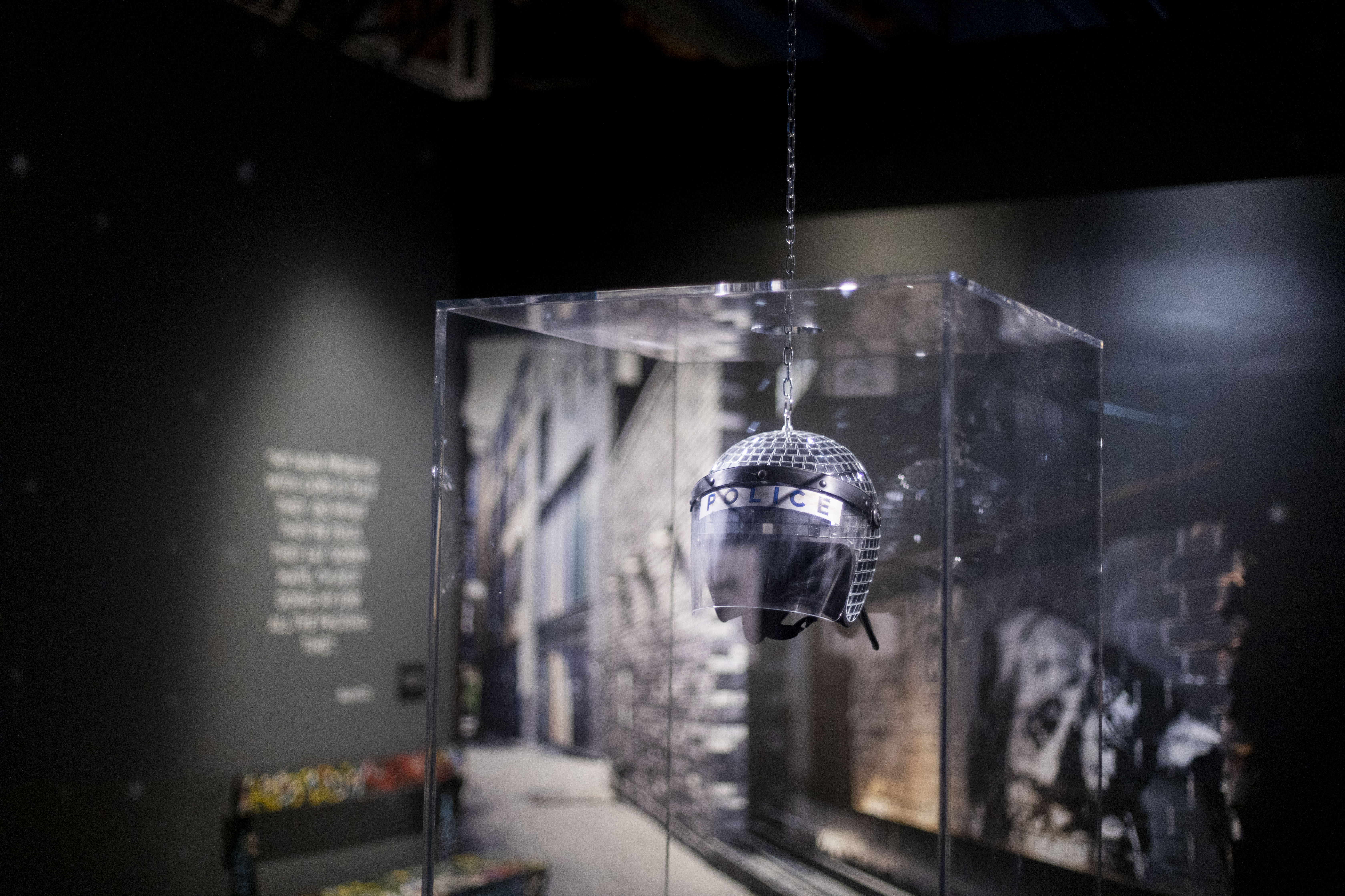 Esta aparente bola de disco, mezcla dos mundos antagónicos: la autoridad, la violencia y el control a través del casco, y los espejos que simbolizan la diversión y el entretenimiento. Así como Marcel Duchamp utilizó objetos de lo cotidiano como el mingitorio, Banksy apela a nuevos sentidos a través de piezas mundanas. ¿Cómo? Se burla de los militares y de la fuerza bruta. No sólo la obra per sé, sino también el título, contiene una ironía; “Met Ball” puede ser una bola de metal pero también una invitación a un baile por parte de la Policía de UK, ya que funciona como acrónimo de “Metropolitan Police Service”. El tema de que la bola brille también es paradójico, porque para el artista la policía representa todo menos luz.