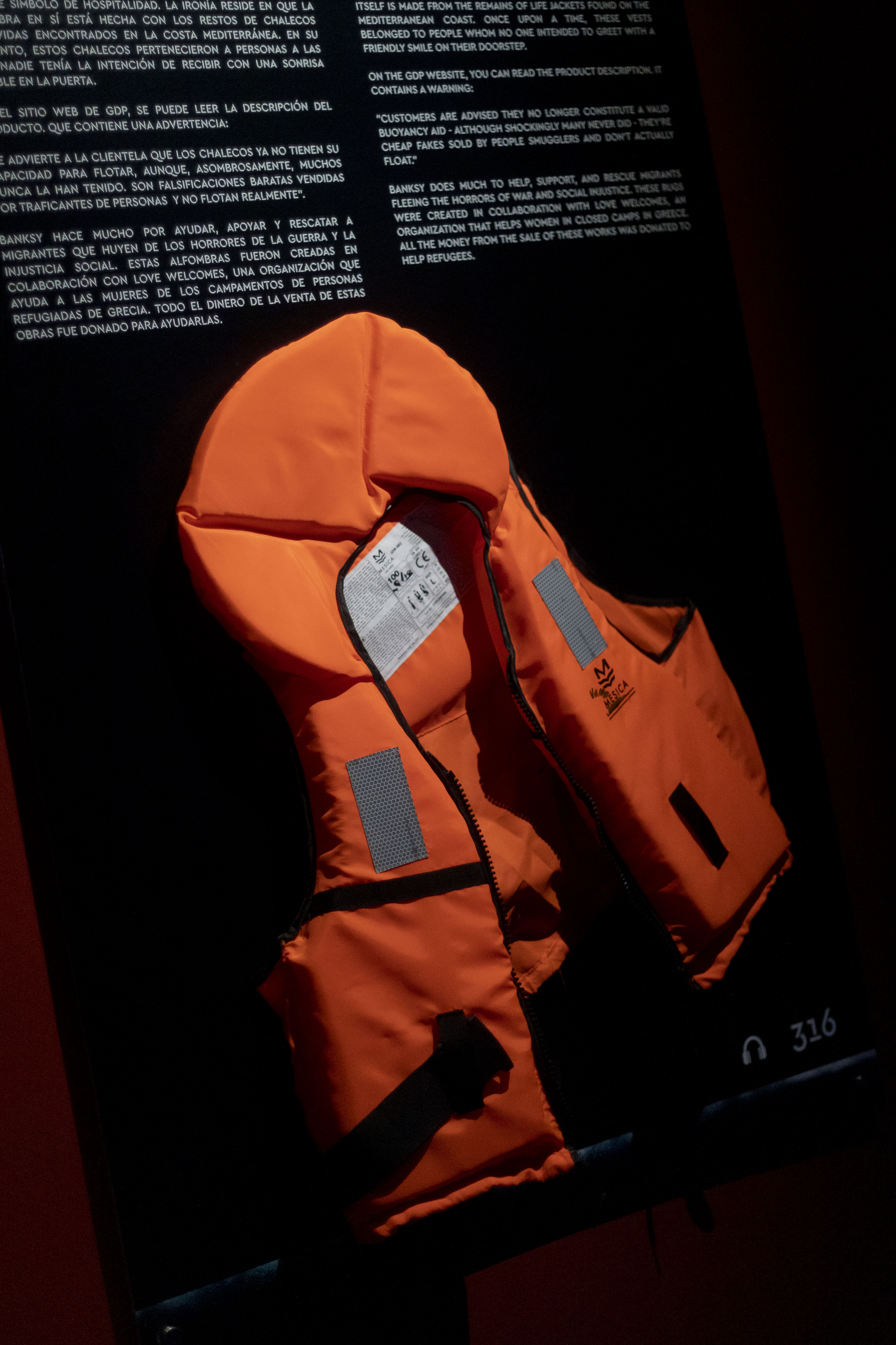 Esta clásica alfombra de “bienvenida”, un aparente símbolo de hospitalidad, contiene una ironía y una vuelta de rosca: está hecha con restos de chalecos salvavidas, encontrados en las costas mediterráneas. Además, estos chalecos son falsificaciones, que no flotan, vendidas por traficantes de personas; Banksy trabaja apoyando a personas migrantes que escapan de la guerra y de injusticias sociales. Esta obra fue hecha en colaboración con “Love Welcomes”, una organización que ayuda a las mujeres refugiadas en campamentos griegos. Su venta se destinó a ayudarlas. Así, el artista protesta, pero también toma cartas sobre los asuntos que lo conciernen.