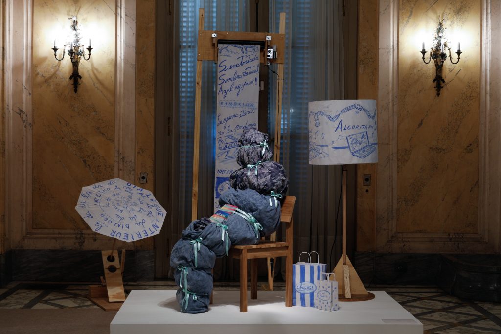 Una tercera sección, en el jardín de invierno o fumoir, presenta una instalación en la que un cuerpo irónicamente enfardado con delicadeza sostiene el volumen Art Now, clásico del 2000, el cual es forzado a leer. Es el descanso en tortura. Frente al horror de su imagen, eleva la amenaza de la industria creativa y frases como “La guerra eterna no la perdimos”, todo ello acompañado de animaciones en azul egipcio y una estética vacilante entre lo comic y el kitch que, dígase al paso, recuerdan a las porcelanas blancas y azules de la dinastía Ming y la manufactura de Delft.