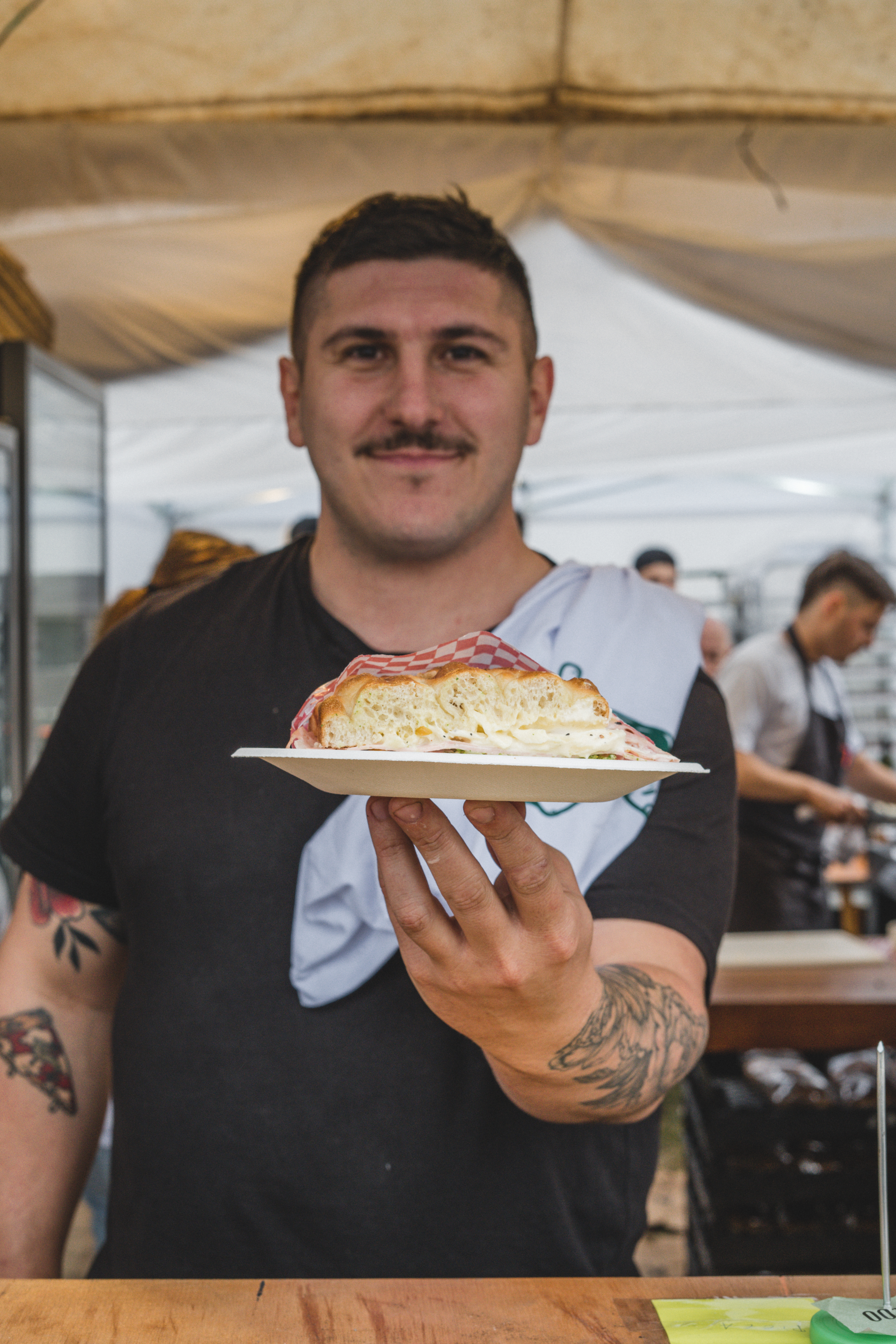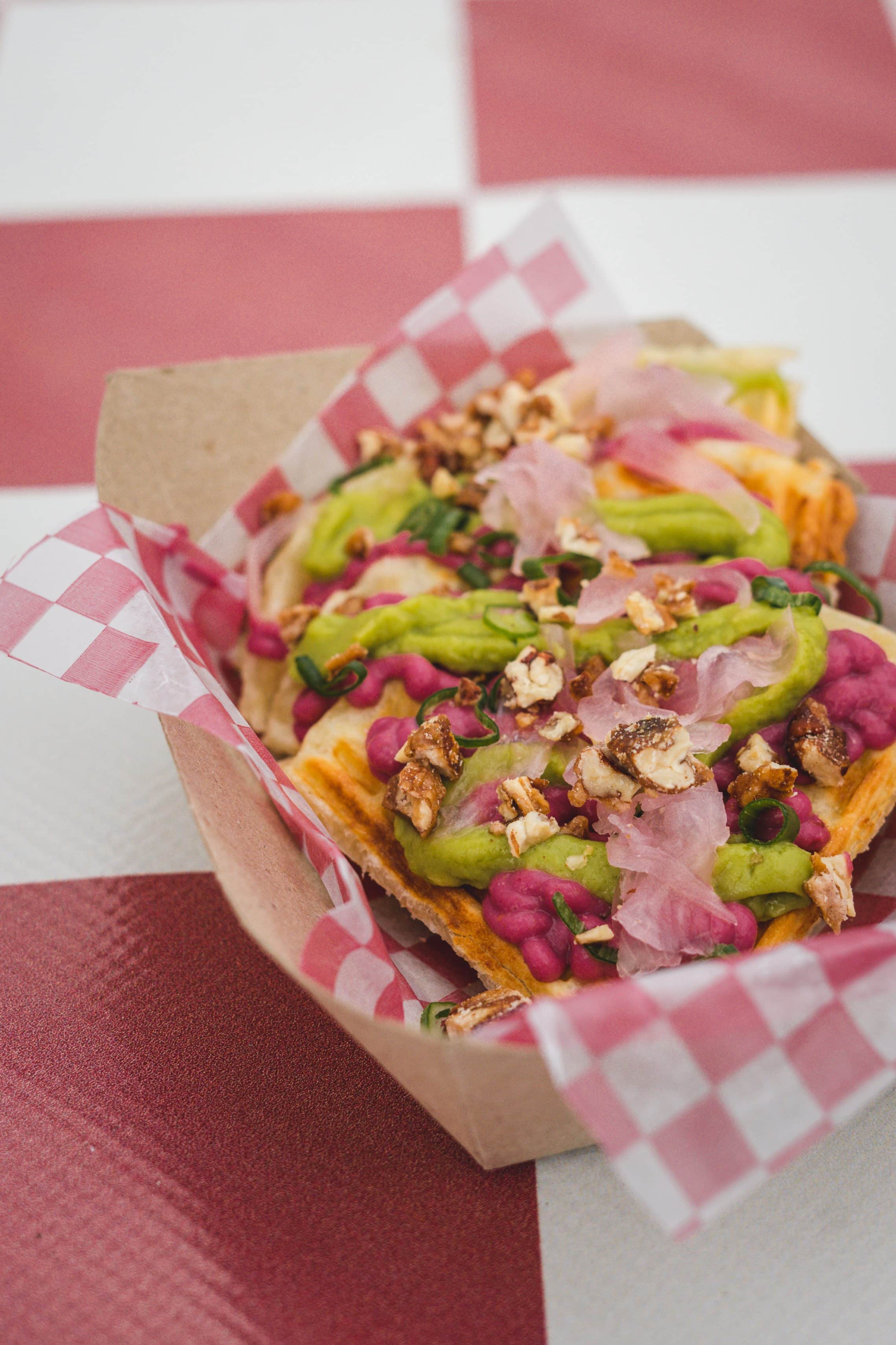 Desde su puesto de Rogelia – bien lookeado, con merchandising y todo – Ale Temporini llama la atención de los paseantes con el megáfono, y al que logra captar, no se arrepiente. En esta edición combinó el amado sabor del chipá con una explosión de sabores: hummus de remolacha, puré de palta, garrapiñada de pecan (ese crocante le viene increíble) y pesto.