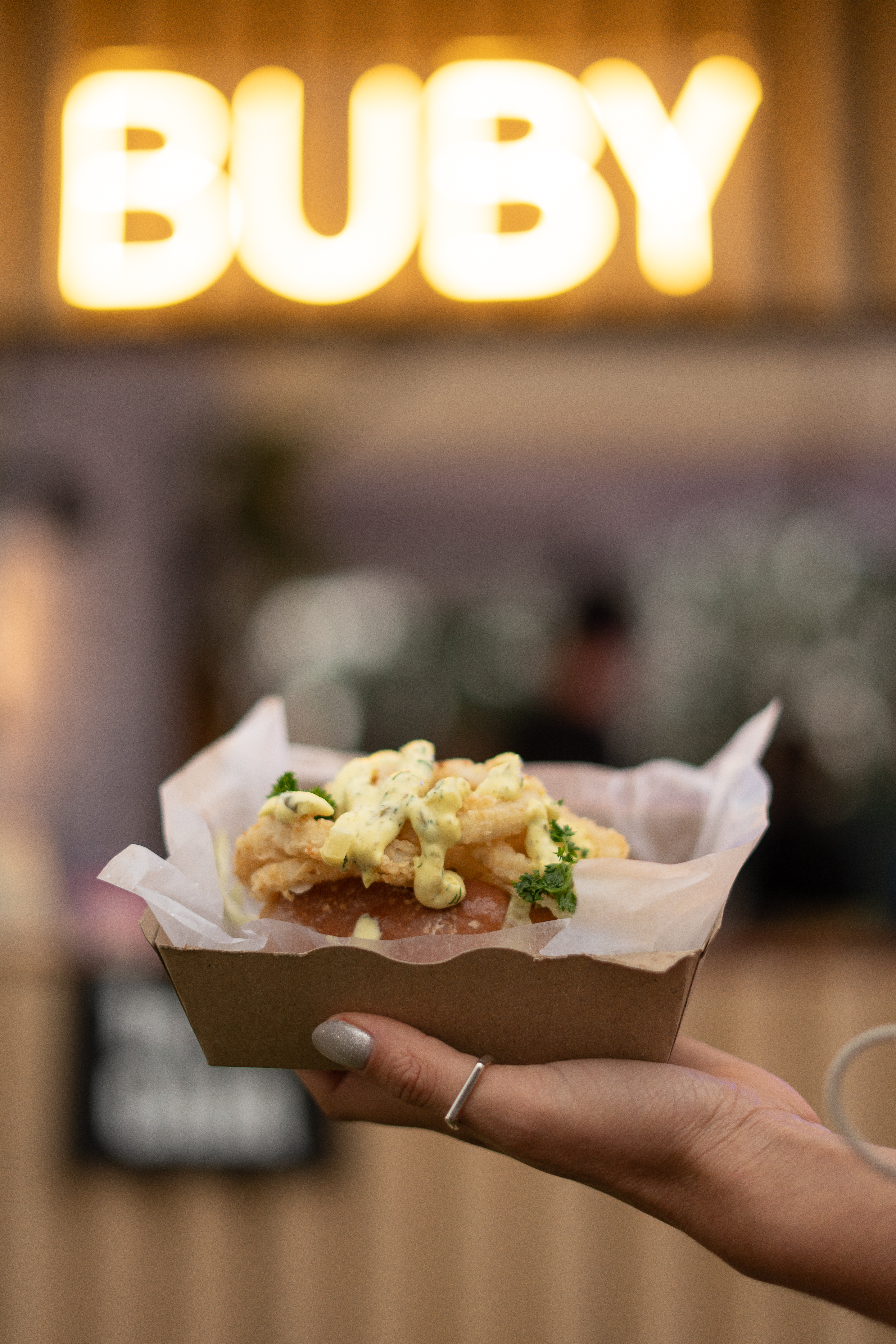 Daniela Butvilofsky tiene su propio stand este año, con un cartel luminoso que lee Buby y tres propuestas unidas por un mismo concepto: la creatividad. Le preguntamos cuál diría que es la estrella y costó unos largos segundos de indecisión, pero al ratito apareció con algo nunca antes visto; un pebete, tierno y esponjoso, abierto a la mitad, y en el centro: rabas. Todo bien humectado con la indiscutida diva del plato, esa salsa tártara de eneldo y manzana. Es un plato para disfrutar enchastrándose.