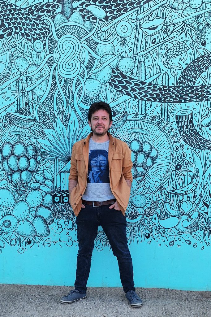 Rodolfo Reich junto a un mural de la bodega Bruma en Baja California.