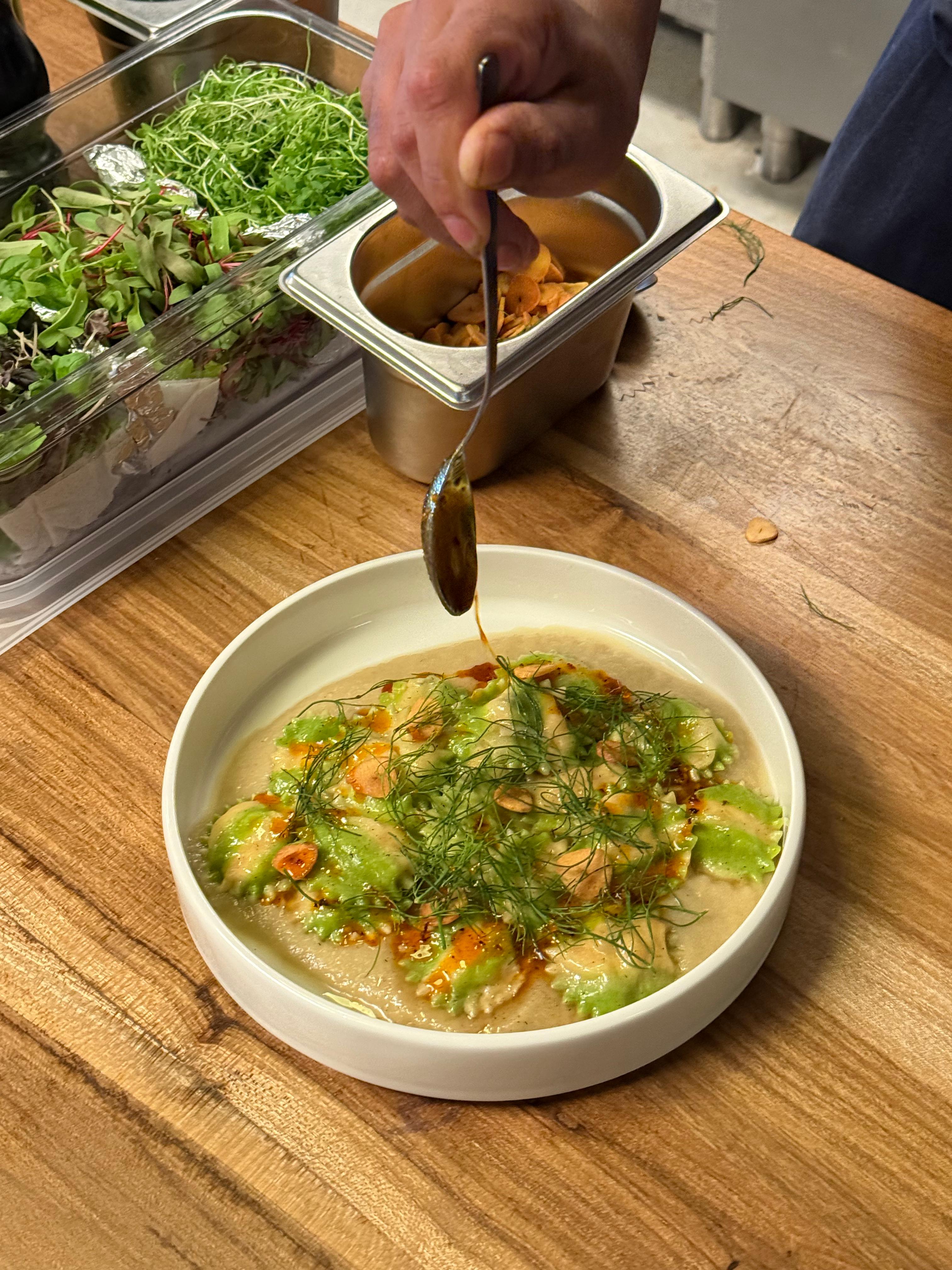Dentro del local, con paredes de ladrillo y una cocina abierta que invita a ver cada paso del proceso, los platos sorprenden tanto en sabor como en texturas: berenjenas glaseadas con alioli de cenizas, hierbas y sésamo negro; papas crocantes con emulsión de pimientos, ciboulette y sal marina; o chauchas salteadas con chiles secos y aceite de sésamo.