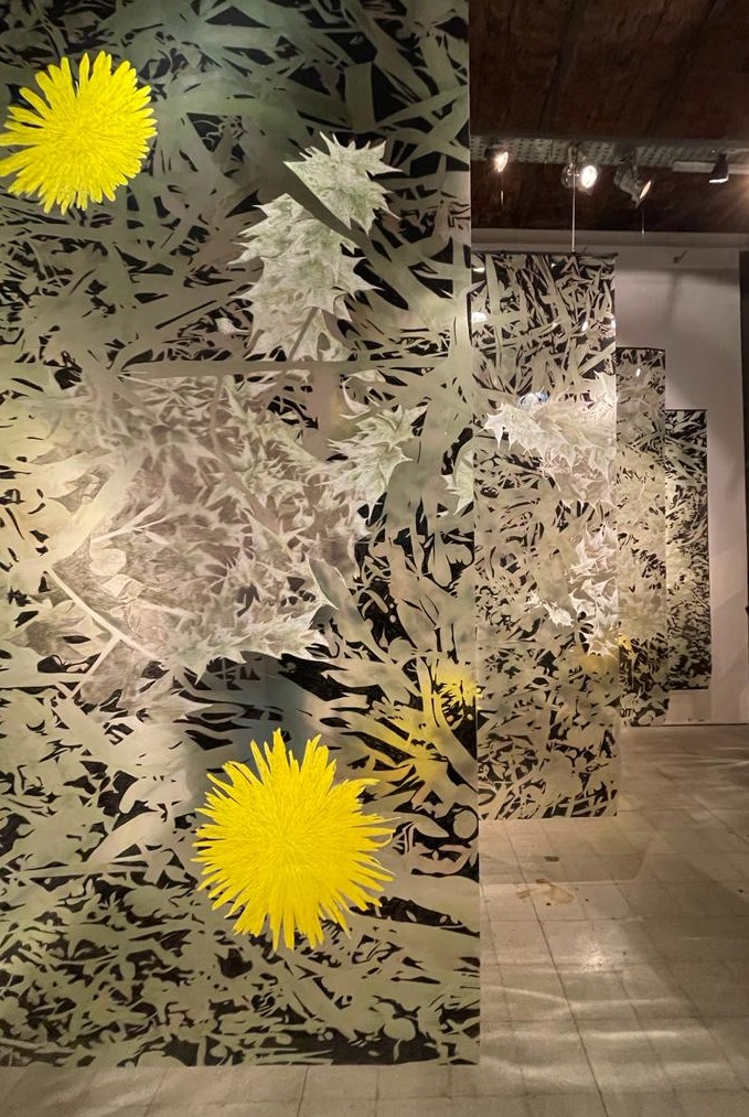 Cambiando totalmente de barrio, mi próxima elección fue Un muelle para el sol en Moria galería, del circuito 2. Subir las escaleras del espacio es adentrarse en un mundo en dorado. Con platos y cucharas pintadas que actúan como espectadores de la conexión. Si estás por Villa Crespo, no podés perderte la activación que realizará Juliana Iriar. Animate a perderte acompañado en el silencio con Escuchas el día viernes a partir de las 16 hs o a fundirte en el ritmo y el frenesí de la mano de Mascarpone Dj Set el sábado.