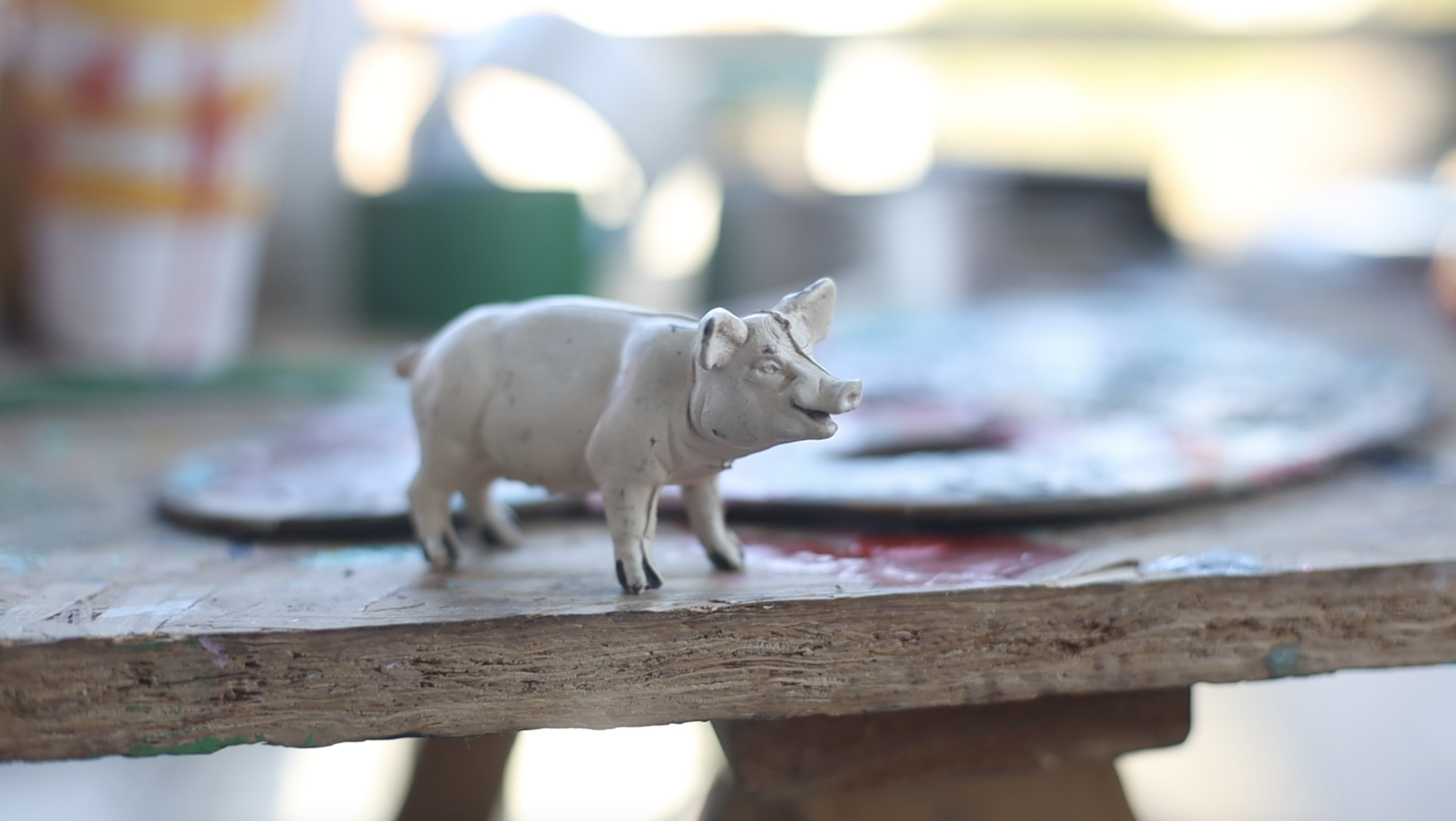 Sí, un cerdito que me regalaron como amuleto de la suerte para mi primera muestra. Desde entonces, lo llevo conmigo siempre.