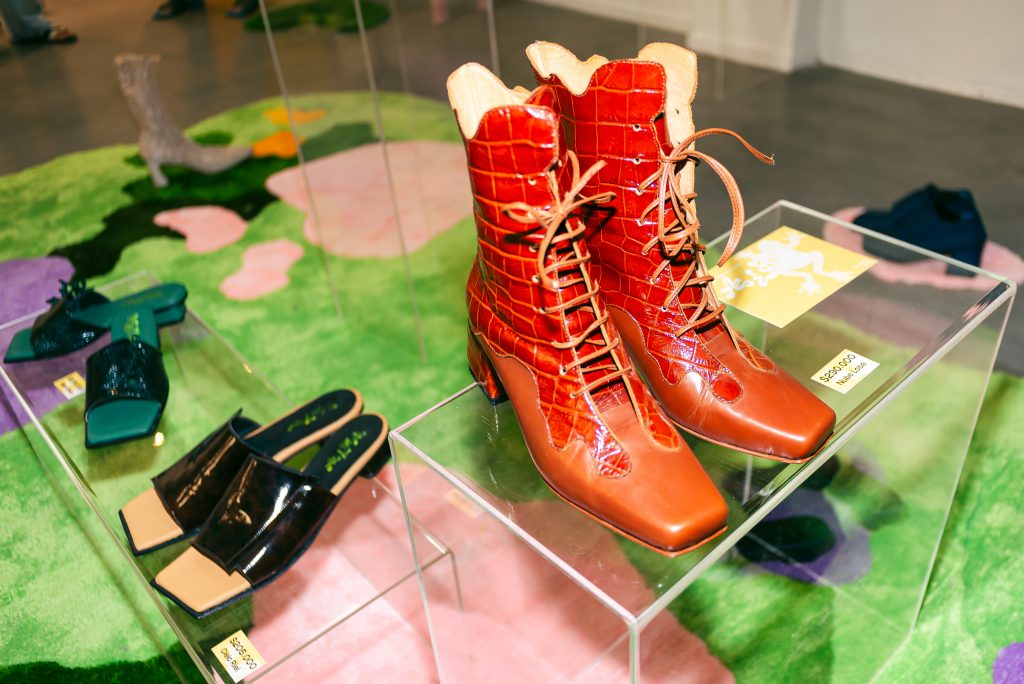 Alga es una firma de calzado de autor emergente que nace como marca a principios de 2024 pero antes que eso su creadora, Aldana García, hace ya seis años diseñaba zapatos a pedido de forma independiente. Ella es dueña de una personalidad eufórica, colorida y amigable, y su showroom la representa a la perfección. Una alfombra XL de colores vibrantes hecha por Casa Croma en el medio de la escena corona al espacio físico como el universo lúdico que vemos en sus redes sociales.