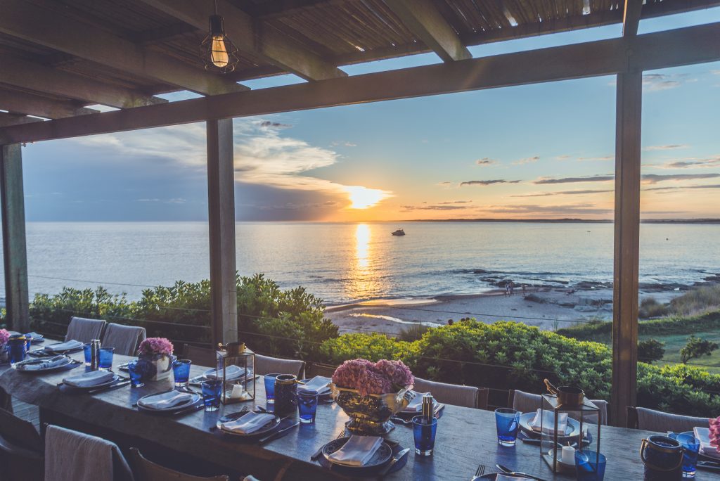 Los platos a las brasas del campo uruguayo, los pescados y los frutos del mar del océano con esta vista sublime.