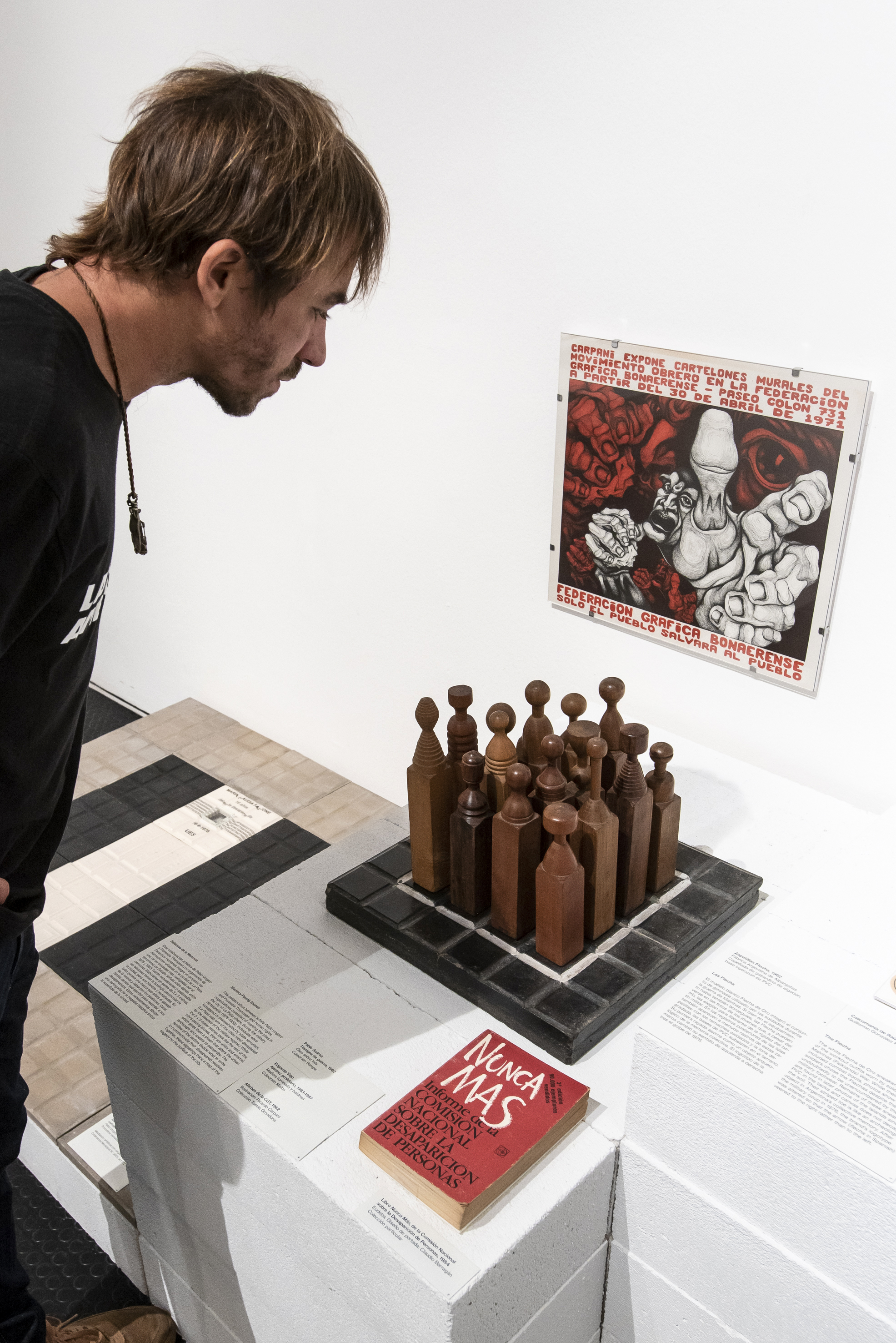 En rojo, descansa el libro “Nunca Más”, el informe de la Comisión Nacional sobre la desaparición de las personas durante el gobierno militar. A su lado, una muestra del proyecto “Baldosas de la Memoria” en La Plata, de Pablo Ungaro y Florencia Thompson, que señala los sitios donde fueron secuestradas y asesinadas personas durante esos años de terrorismo de Estado. Caras, nombres y palabras de sus familiares.