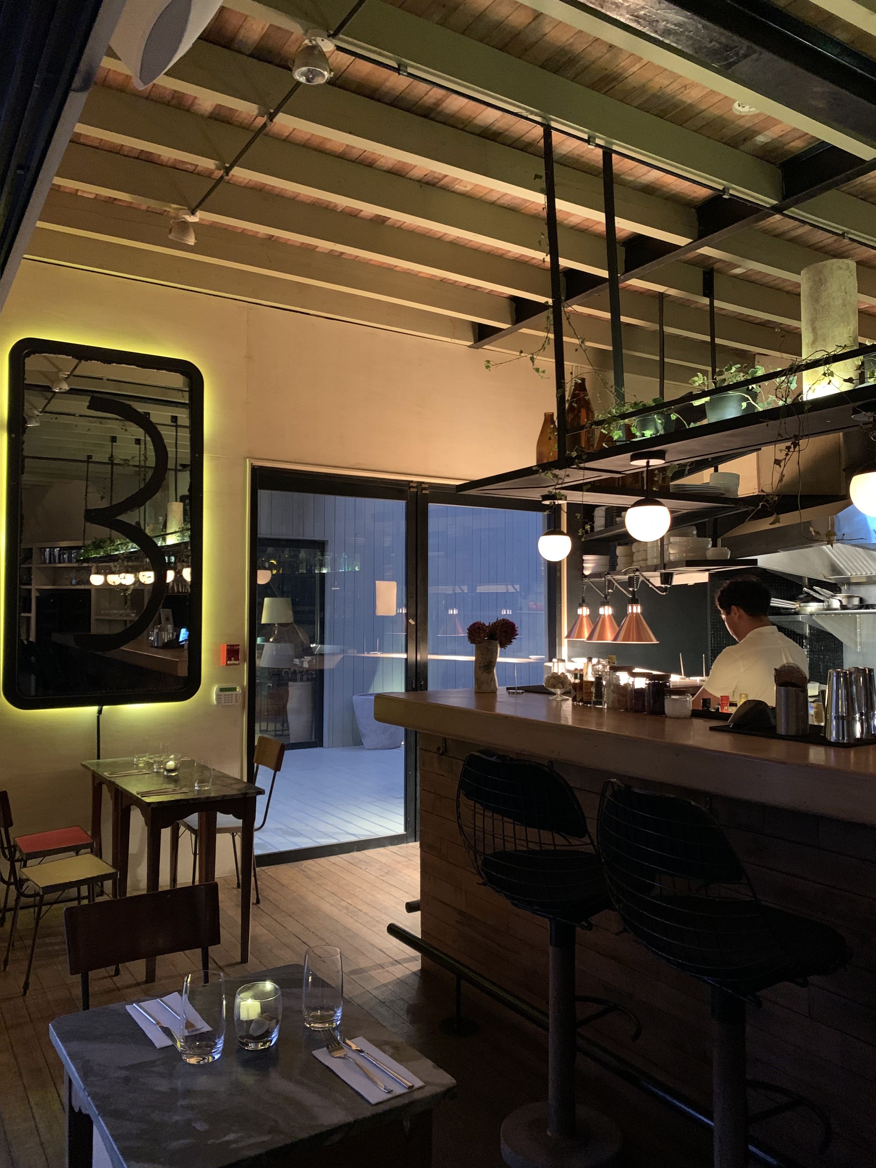 El ambiente con luces bajas, una gran barra y la cocina a la vista es muy agradable.