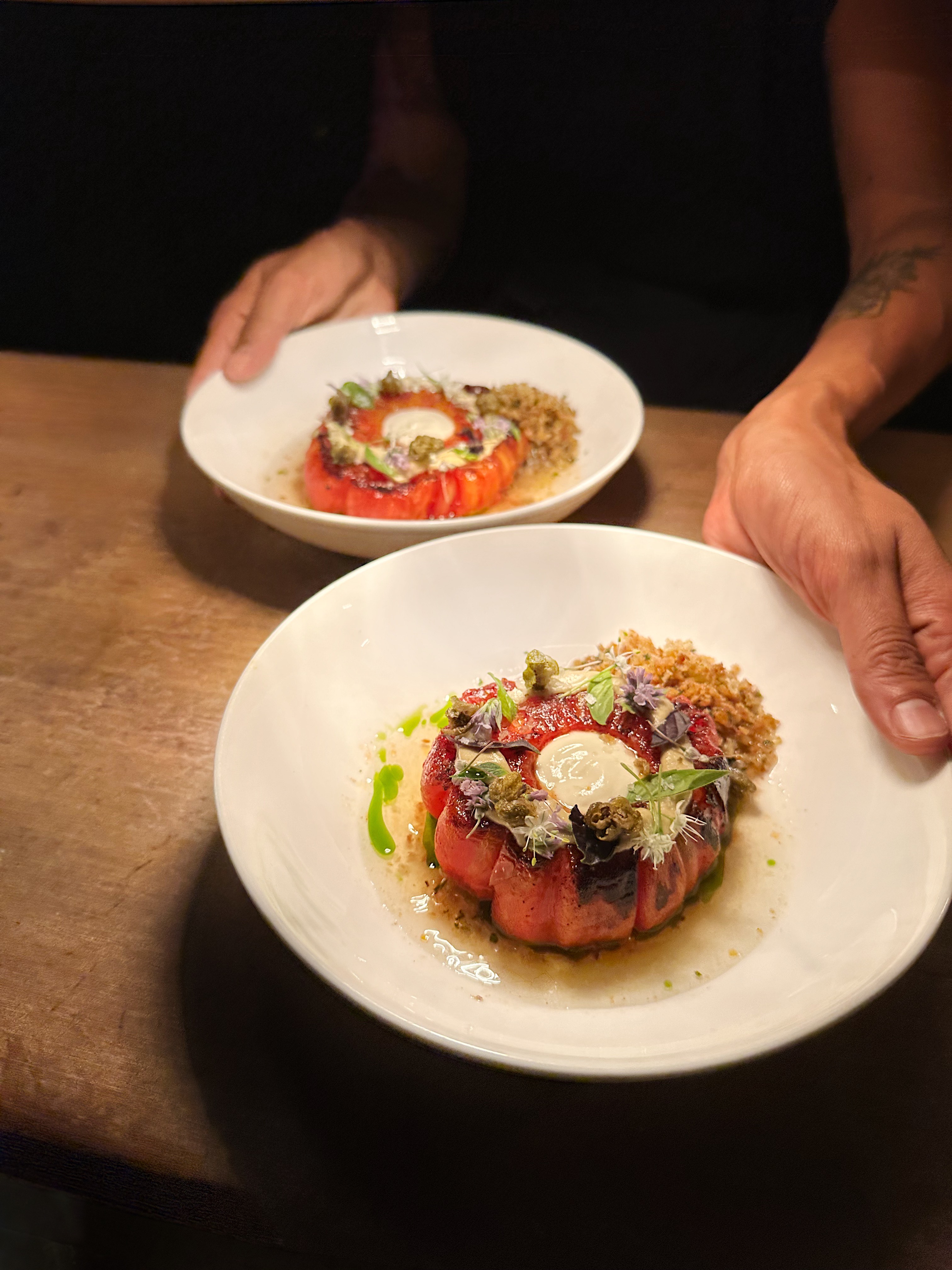 “El menú está armado en base a lo que me gusta hacer a mí, que es la pasta. Los platos van a ir rotando porque nos gusta hacer cosas nuevas todo el tiempo. Y el resto del menú se arma en base a lo que tenemos a la vuelta, fresco y de productores orgánicos y locales que nos fuimos haciendo amigos en estos años trabajando acá: Aldana con su huerta de aromáticas, los pescadores Pirulo y Pablito, Maritza nuestra productora de carnes y Pierre el productor de patos” le cuenta a MALEVA Félix Babini.
