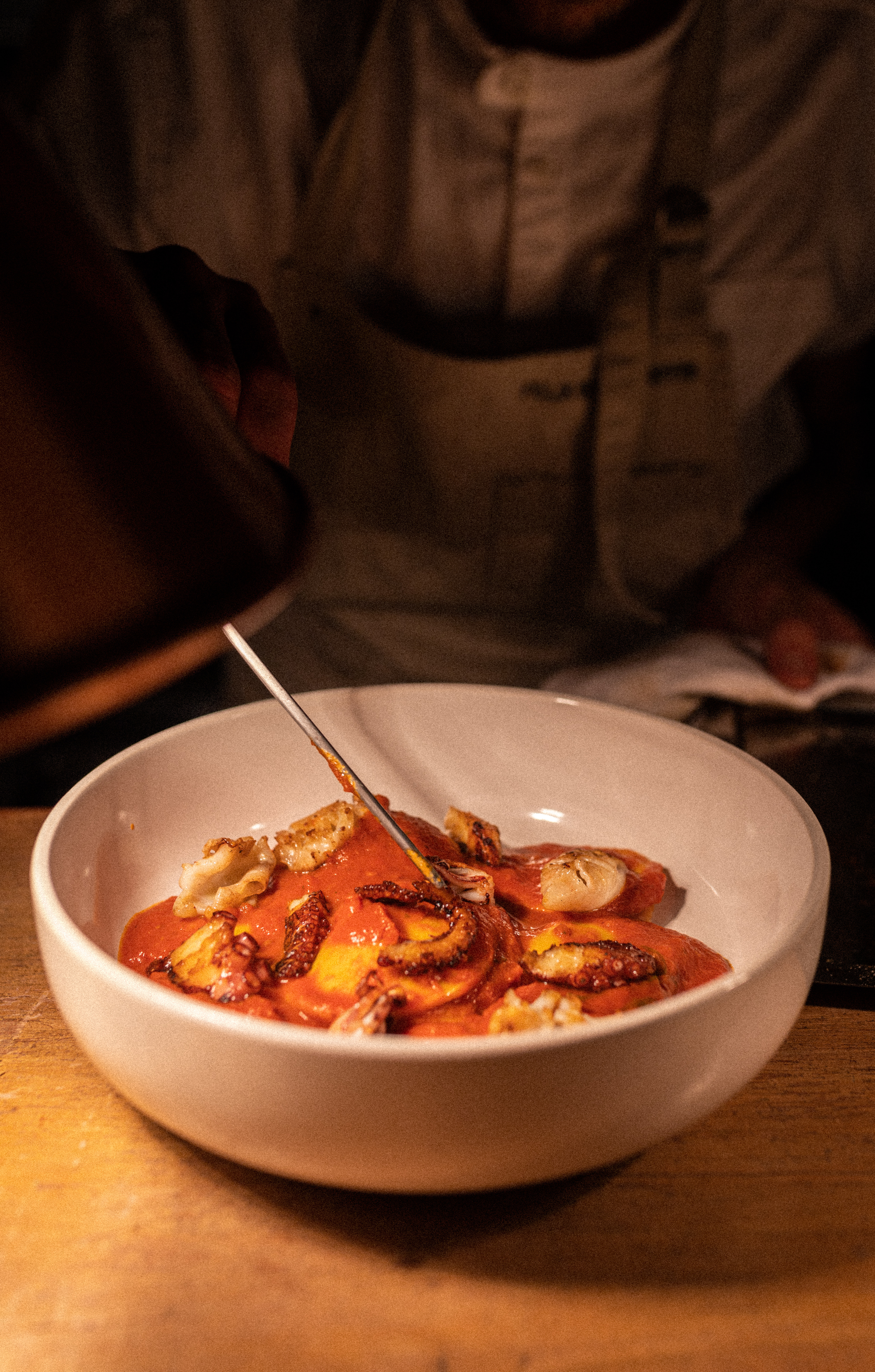 La pandemia también cambió la vida de Tomás, quien se vino a vivir junto a su familia a Punta del Este y se hizo cargo de la propuesta gastronómica de Rizoma. El verano 2022 volvió a encontrar a Félix y a Tomás haciendo de las suyas, con las noches de pasta en la librería de La Juanita. Todos hablaban de ese raviol con caldo de hongos y un huevo en el centro. Este año la apuesta fue más grande y juntos lanzaron TRES.