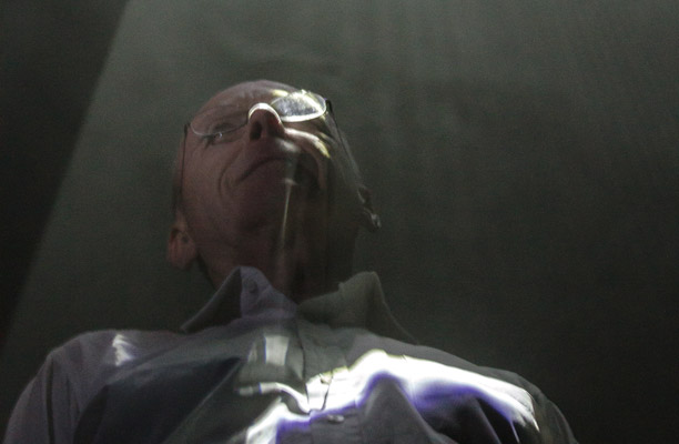 Anthony McCall, abajo de una de sus esculturas de luz en el Faena Arts Center