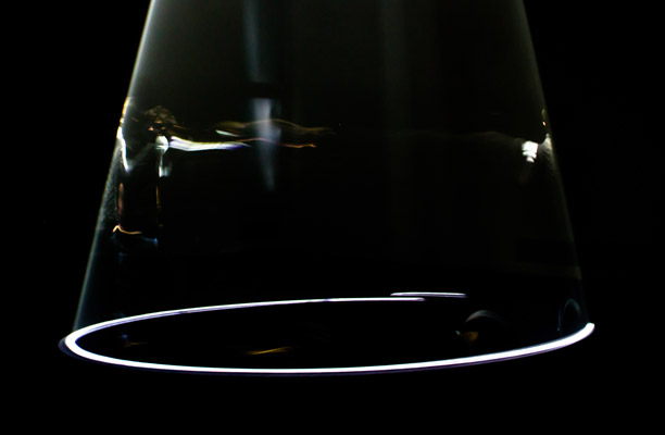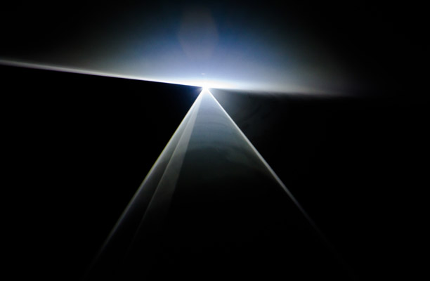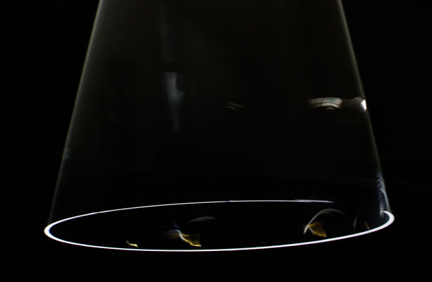 Lo que intimida es la oscuridad (todo el segundo piso del Faena en penumbras). Los visitantes somos ciegos, con miedo a tropezarnos, que nos acercamos con pasos breves de diez centímetros, tanteadores, hacia unas figuras místicas: las pirámides de luz. Tridimensionales, que dibujan – atravesando una fina capa de niebla – contornos blancos en el suelo. La experiencia es misteriosa, como si se caminara en una representación mental del universo, en un templo críptico, con referencias ajenas, al que se ingresó sin permiso.