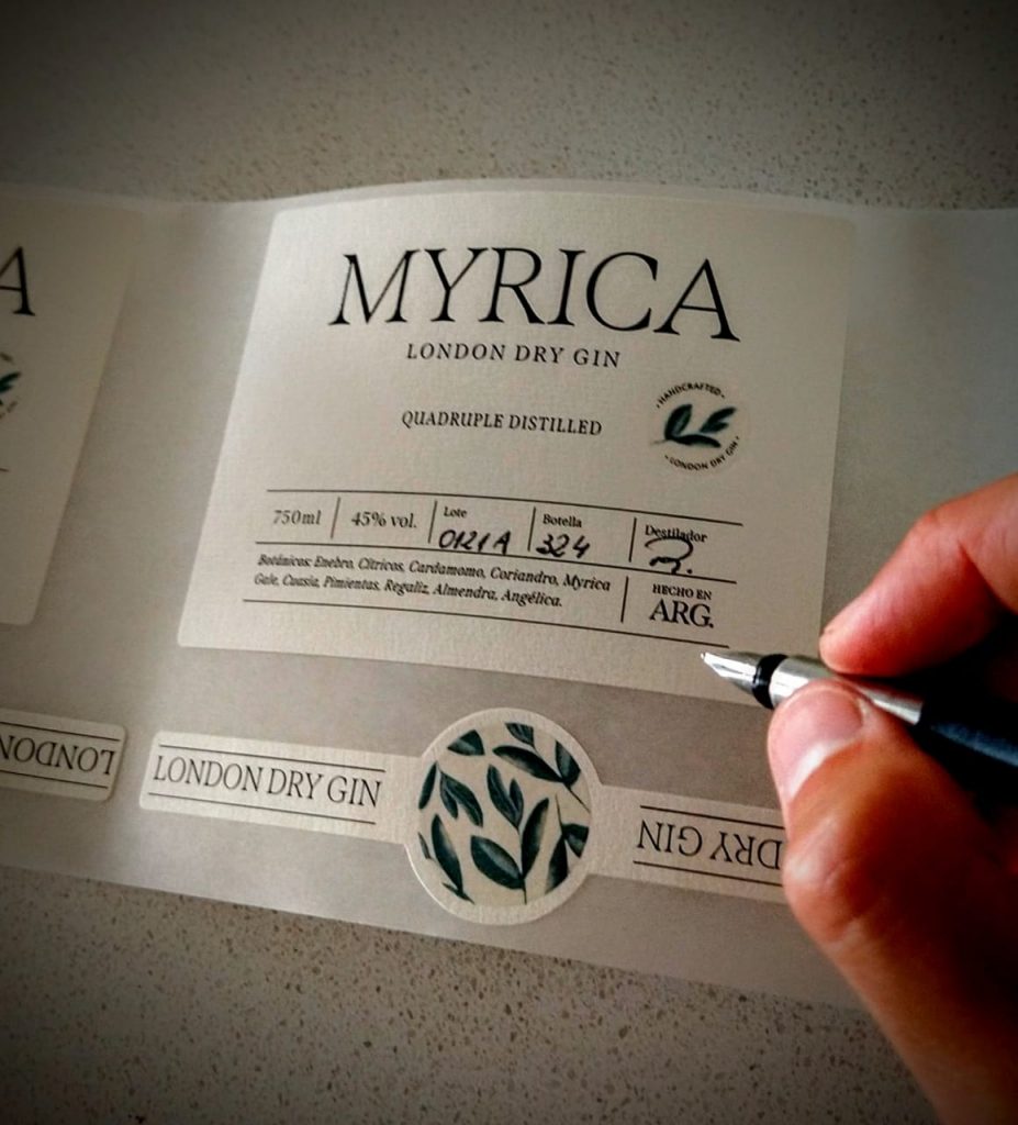 Rocío destaca el diseño minimalista y sofisticado de la etiqueta que busca reflejar el espíritu natural de su producto, con un dibujo transparente en acuarela de las hojas de Myrica, su tipografía clásica al frente y el toque artesanal de su firma en cada botella numerada.