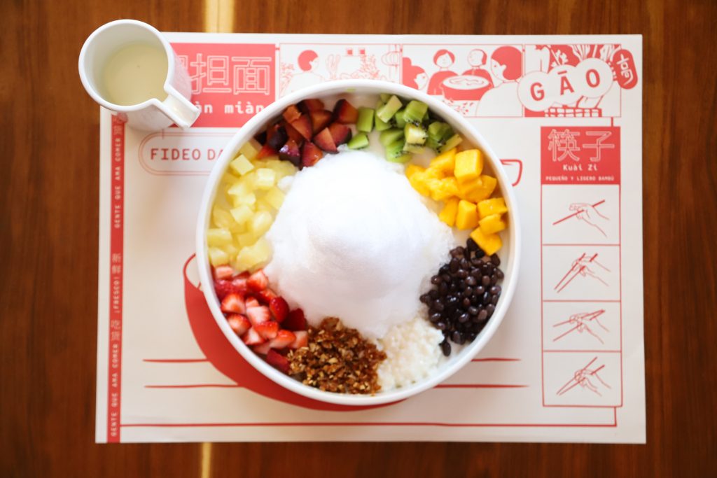 Les dejo mi selección personal: baby ribs, pollo tres aromas, fideos estofados, coliflor agridulce y helado chino. En realidad no es un postre; es street food. algo que comemos como merienda. Es muy visual porque los chinos siempre dicen que la comida es 色香味俱全 o sea tiene que tener color, aroma y sabor. Por eso, el helado es lo más vistoso posible y nosotros le pusimos 8 toppings porque 8 es el número de la suerte. Dentro de ellos hay varias frutas, porque el verdadero postre chino es solo frutas.
