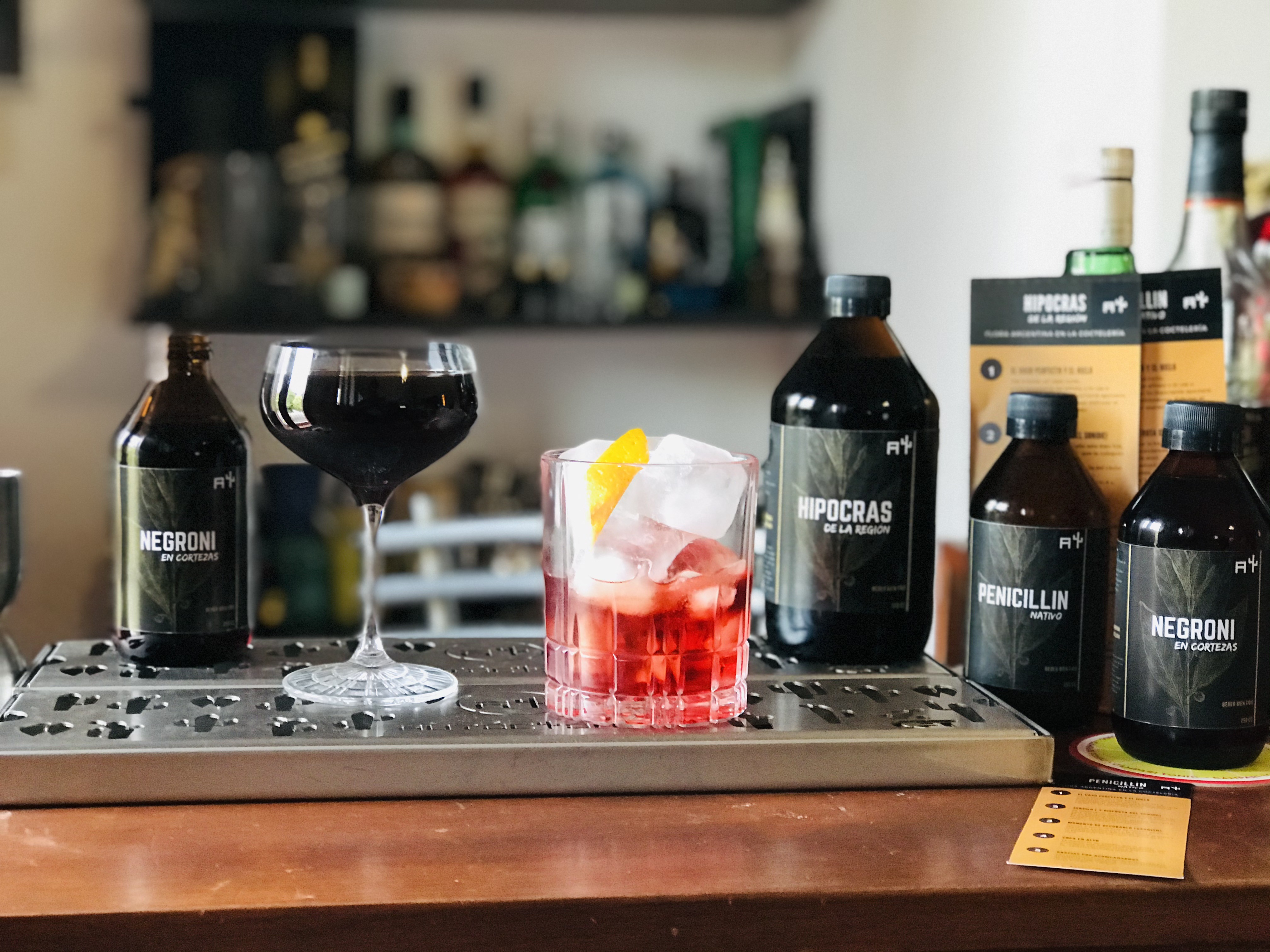 “Hay decocción de cortezas de árboles medicinales, cocciones a baja temperatura, macerados en algarroba e intervención de brasas con miel orgánica, hojas y tallos”, explica Brizuela, quien en su versión a domicilio se decantó por cuatro recetas en las que ya venía trabajando con anterioridad: el Hipocrás de la Región a base de suico, el Negroni en Cortezas con corteza de chañar, el Penicillin Nativo con pezuña de vaca y el Campari Tonic Silvestre apoyado en una caramelina de tónica y cedrón.