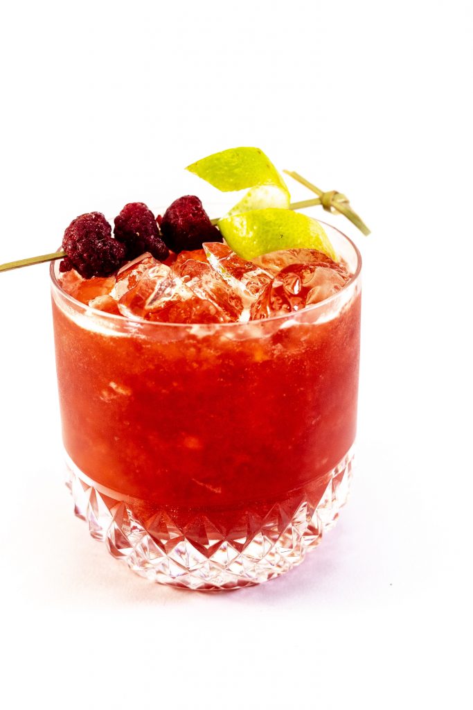 45 ml de Fernet Branca, 60 ml de Reducción de frambuesas., 22,5 ml de jugo de lima, 30 ml de almíbar, 4 frambuesas. En una coctelera agregar Fernet Branca, la reducción de