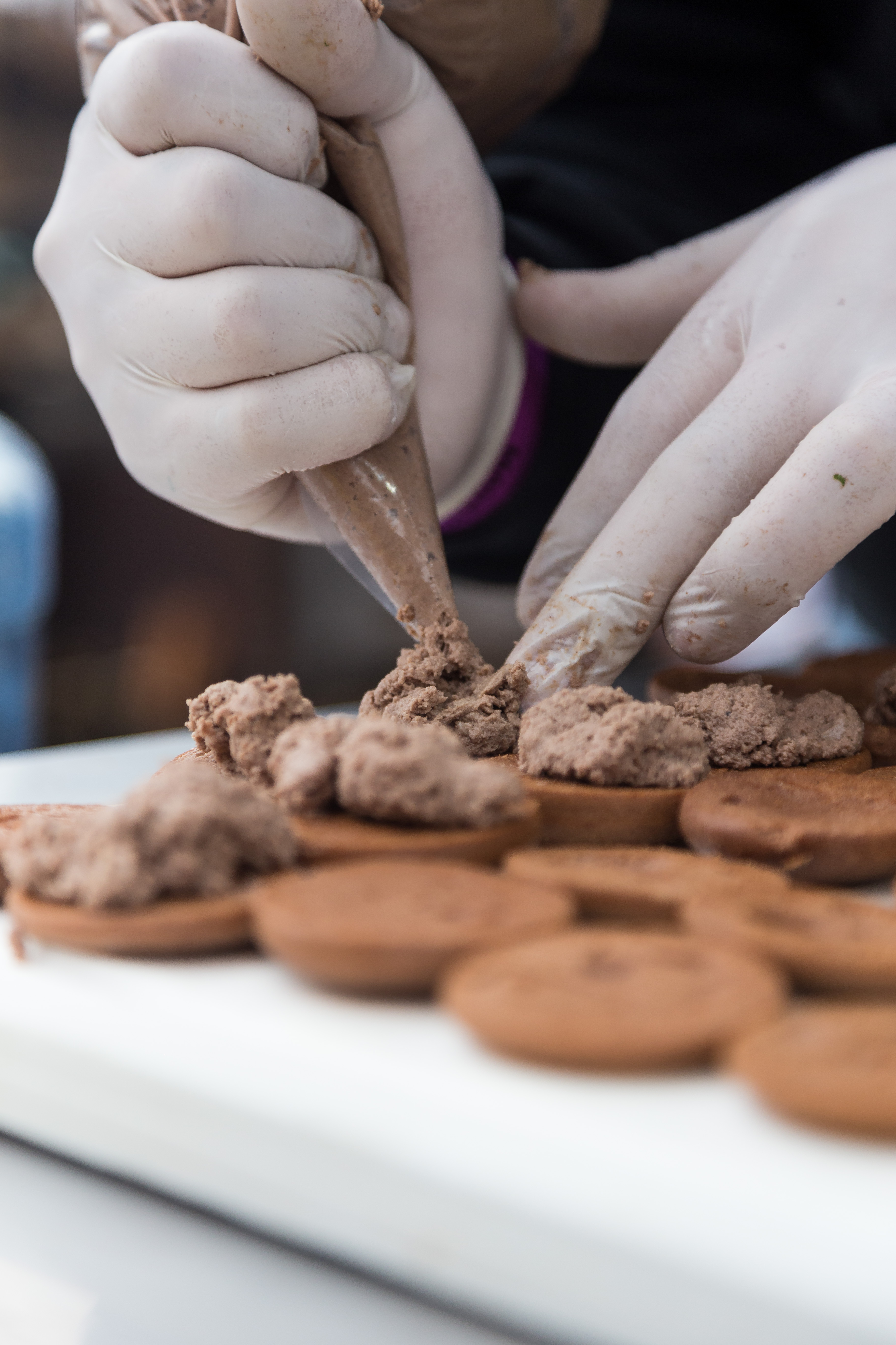 ¿La propuesta de Chila? Un alfajor de morcilla que ya se perfila como el más pedido de la feria. Según nos cuenta el chef Pedro Bargero, este alfajor salado está pensado como un snack, como un plato para picotear y poder así probar varios más: “La masa es de cacao y algarroba; el relleno es de morcilla fría, con verdeo y avellanas. Por fuera, charqui de llama”.