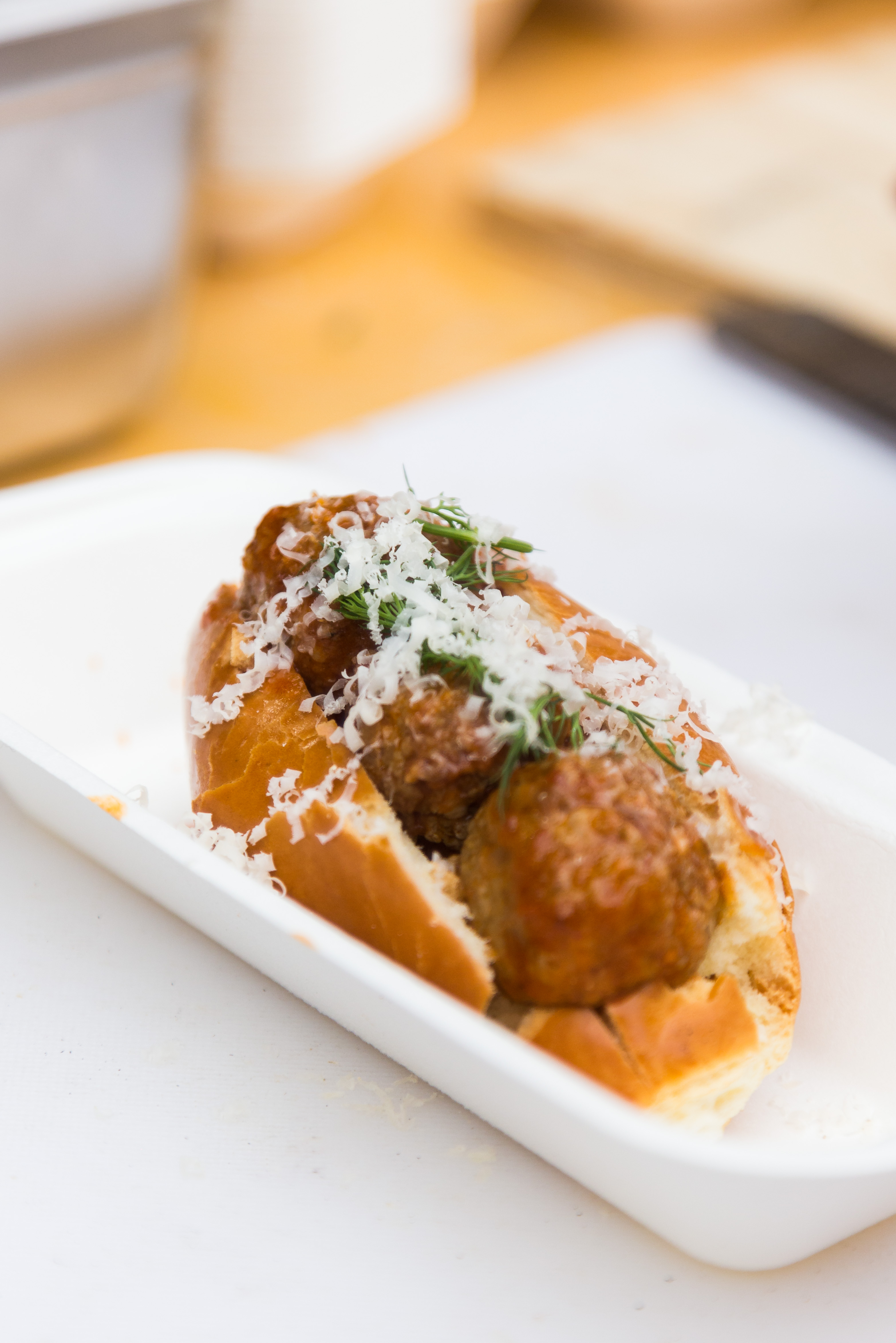 Las albóndigas son abundantes y se presentan en un pan brioche mega esponjoso. Se completa con pickles y queso cheddar de Estancia La Suerte, que sigue la receta tradicional tal como se lo elabora en Gran Bretaña.