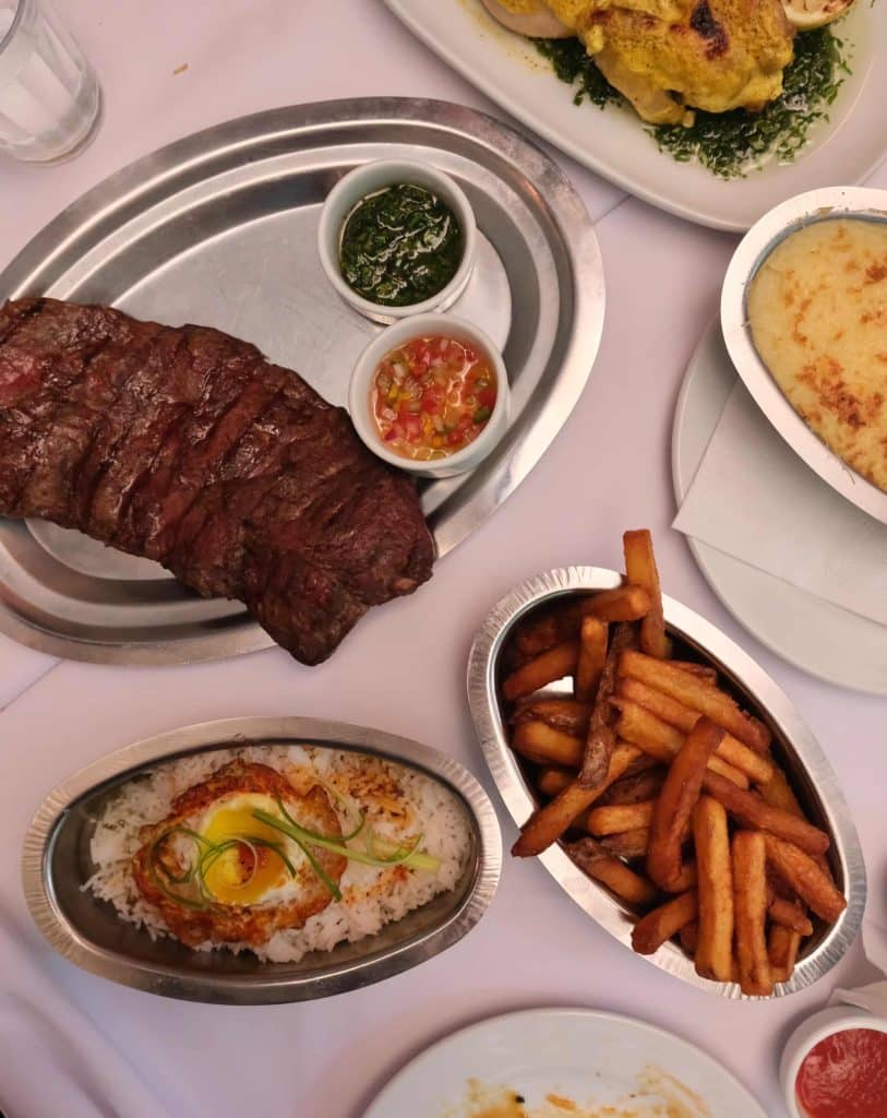 Con platos atemporales enraizados en nuestra historia gastronómica, ofrecen opciones como la milanesa clásica —que enfatizan, tras una coma, argentina—, revuelto gramajo, empanada de carne con yasgua, entraña con pimienta verde y ojo de bife. A su vez, apelan a la memoria con un postre vigilante de lúdica presentación —que dialoga en composé con el tapizado del sillón— o su Don Pedro con garapiñadas de nuez.
