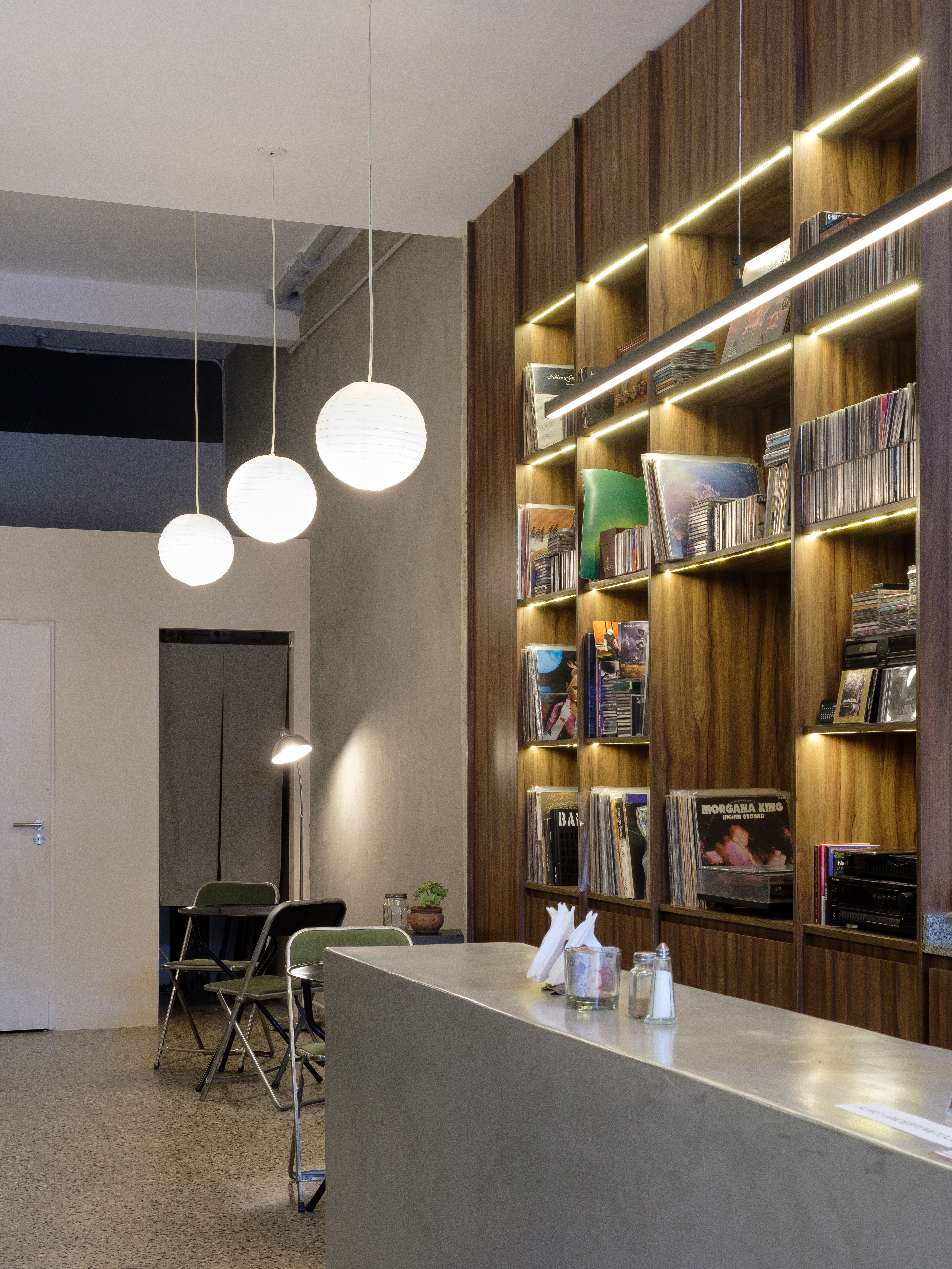 Inspirado estéticamente en los lugares de escucha japoneses como Stereophonic Sound o KOMFY, mantiene la espontaneidad que caracteriza a las cafeterías de Buenos Aires. Con una propuesta minimalista, el espacio gira en torno a un mueble de madera que alberga una colección de CDs y vinilos. “La música es transversal al local, estamos todo el día escuchando, hablando de música y compartiendo experiencias. Toda la colección de discos se puede ver, tocar y elegir. También los clientes traen sus discos, cassettes o cds”, comenta Julián.