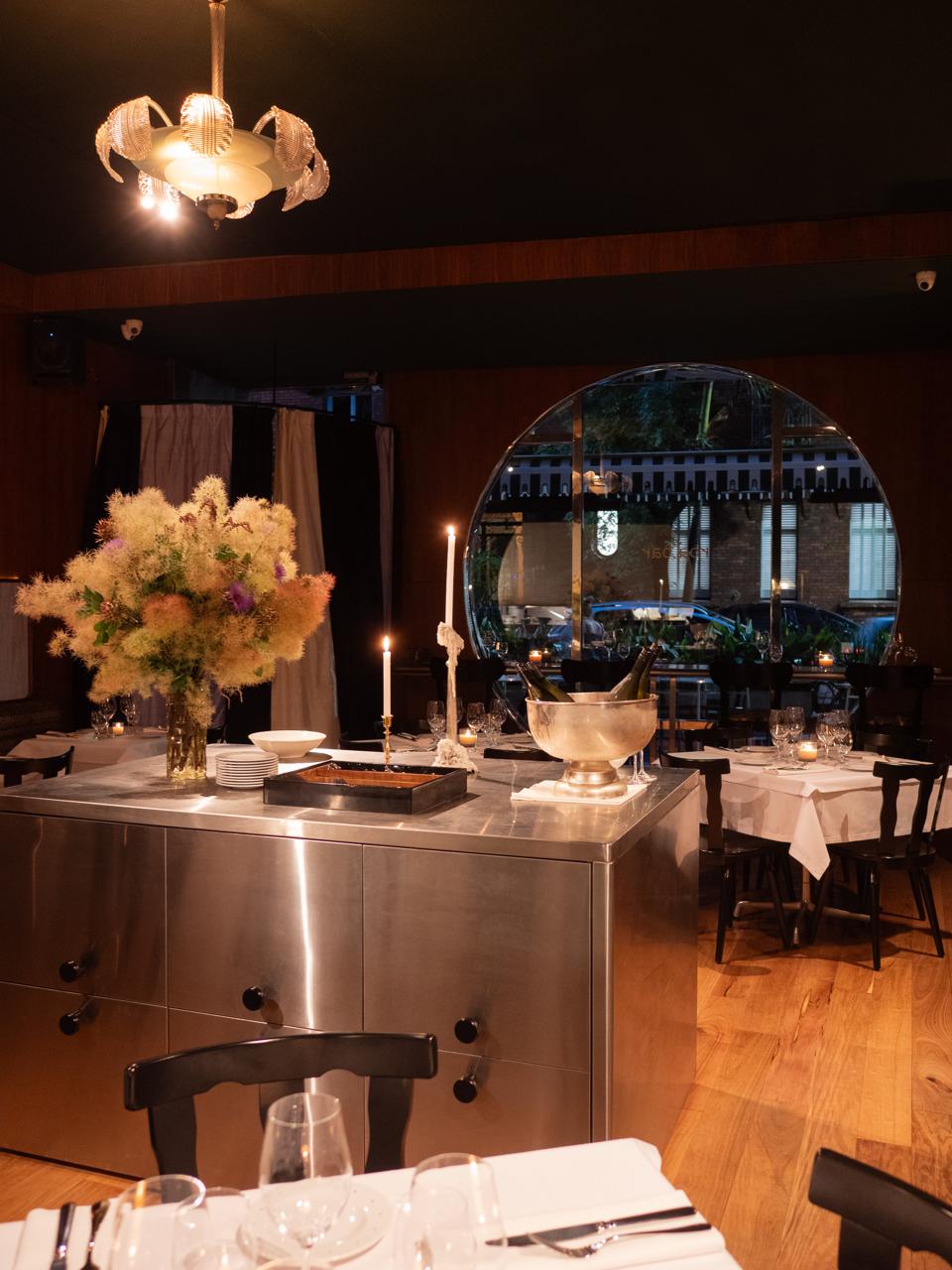 Su búsqueda estética genera una atmósfera cálida que transporta a un bistró parisino sin dejar de lado los detalles porteños: velas, lámparas antiguas que evocan las italianas de Murano, una isla central de acero con un ramo imponente de flores, su vajilla, sillas de madera y su inconfundible ventanal circular.