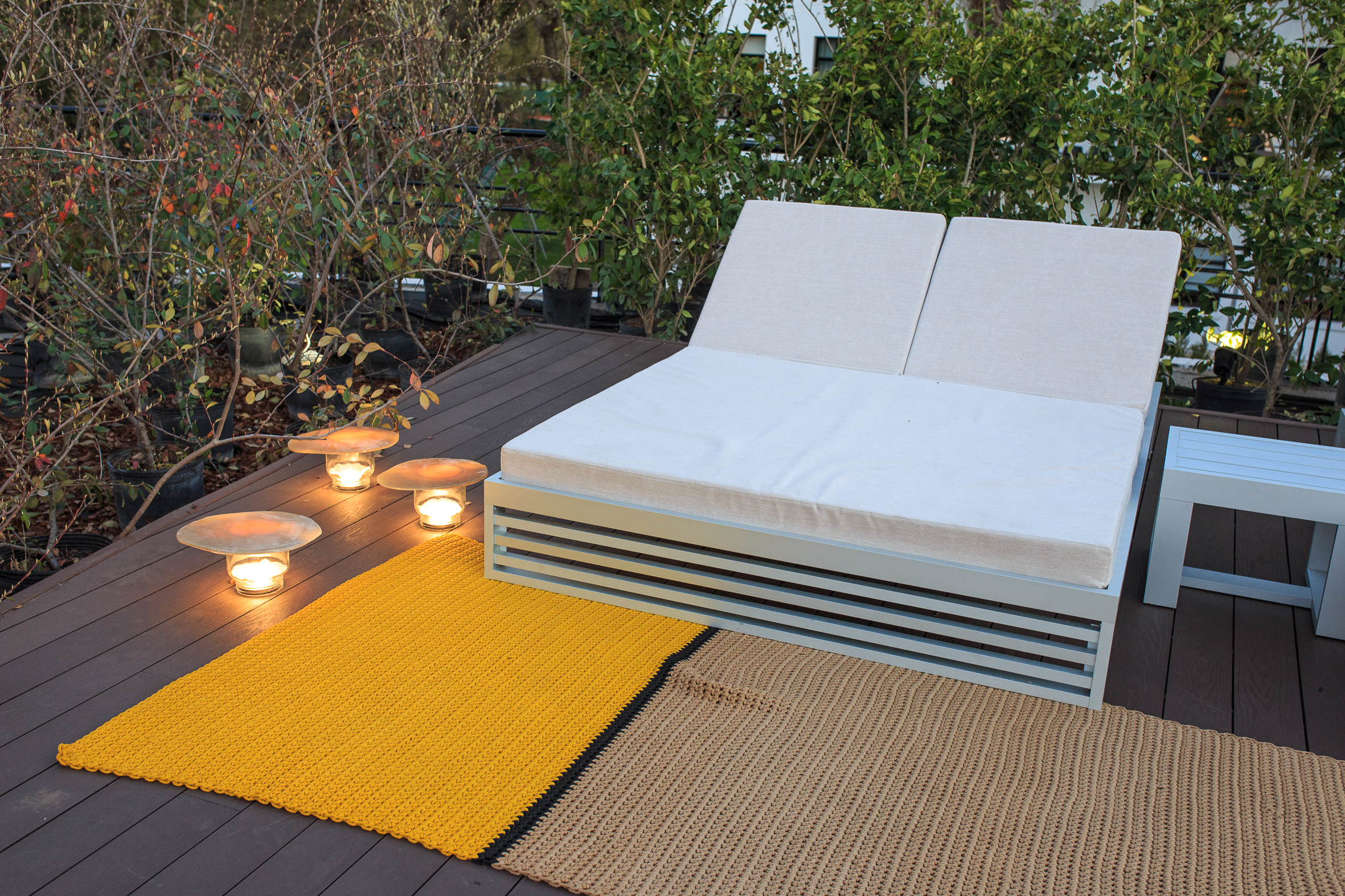 Adriana Sierchuk -sentada en uno de los hermosos sillones de Malibú que crea uno de los tantos livings de exterior- cuenta que utilizó su doceava participación en FOA para convocar a su hija, que hizo unas curiosas lámparas en resina que aportan un toque fungi y tenue al espacio elegido para el relax dentro de la expo.