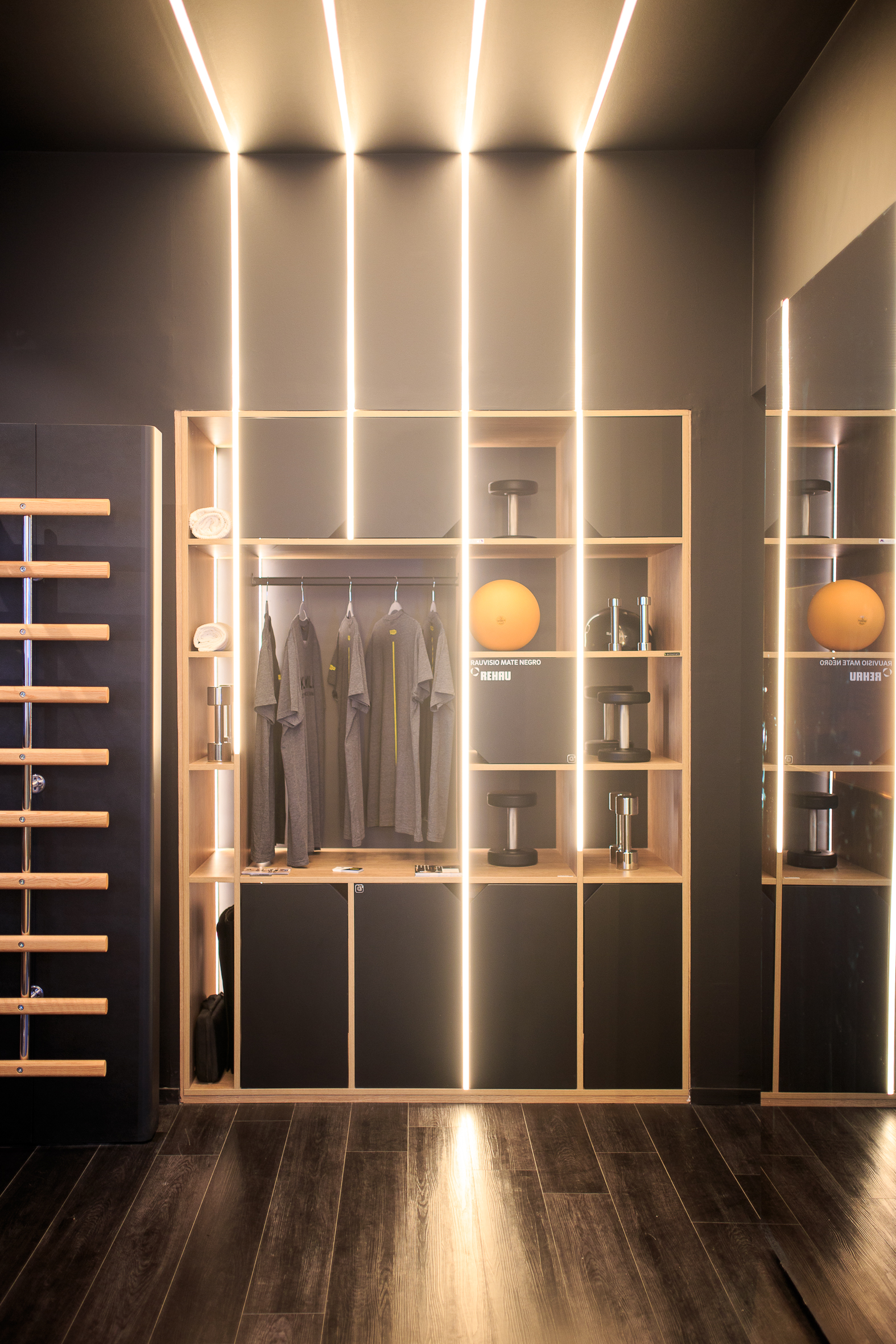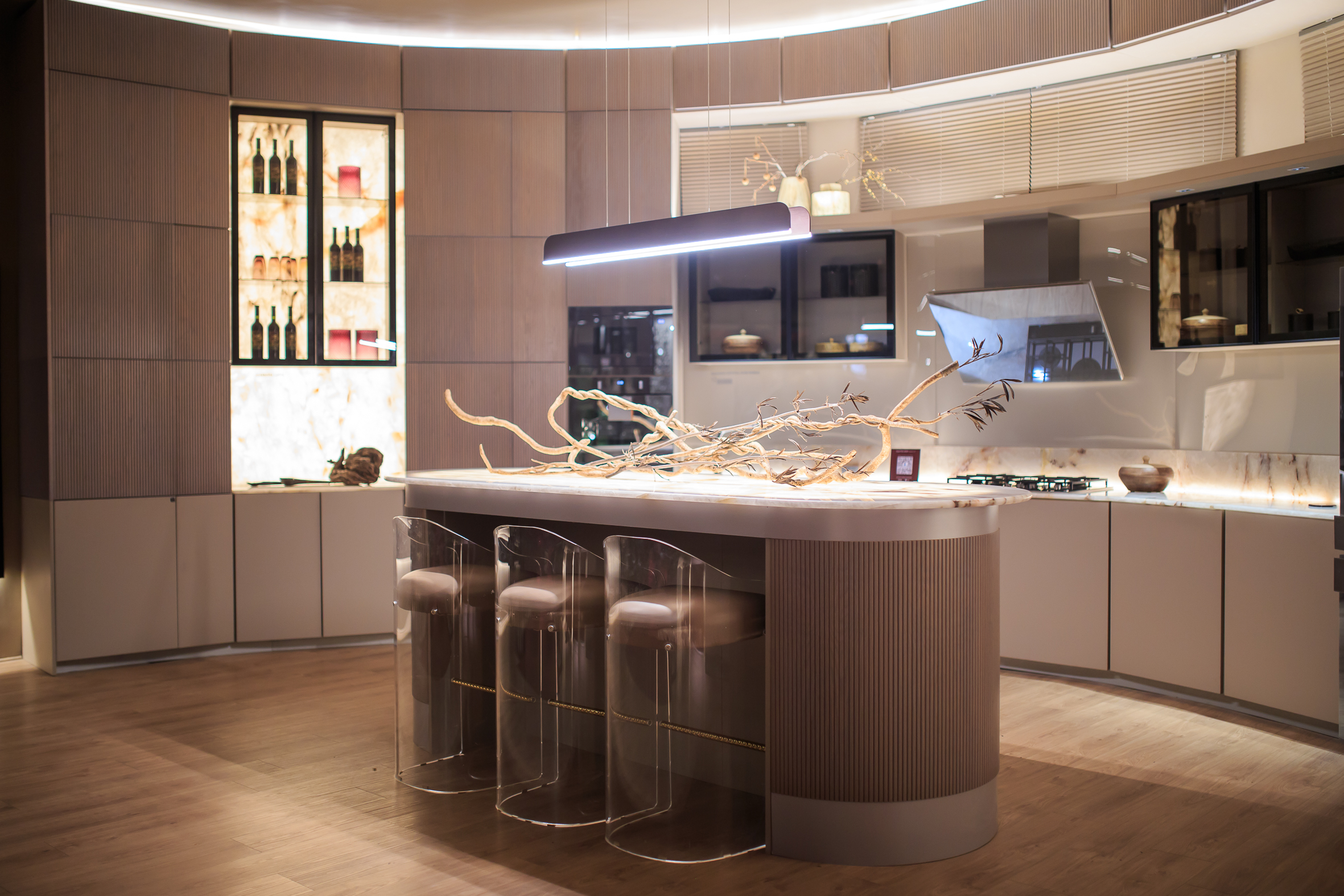 La cocina es enorme y dueña de una barra retroiluminada que juega entre notas claras y delgadas líneas bordó. Esa fina línea conduce a un living central donde las prendas, los sillones y los techos bajos remiten a un sofisticado y sensual juego: nadie podría dudar que es un espacio que empodera.