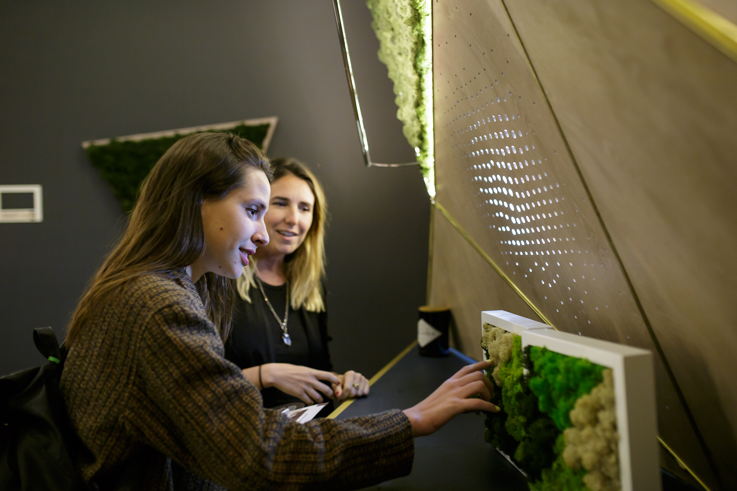 Los líquenes escandinavos de diferentes colores tapizan los vericuetos e invitan a viajar, con una propuesta totalmente disruptiva. “Queríamos que genere intriga entrar, por sus texturas, luces y sombras y aromas. Los vegetales estabilizados duran 15 años y están pegados en una plancha de aluminio de manera artesanal”, explica Lola comprobando la atractiva textura y colorimetría de las plantitas.