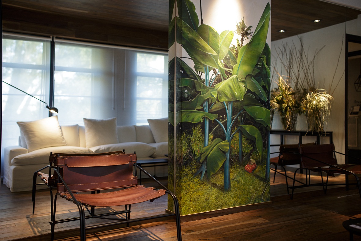 El escritorio vibra de color, las pinturas de Angeles Gollan dibujan un panorama tropical y atraen la naturaleza al interior. La luz cuasi teatral -lograda con artefactos embutidos de led- coronan una obra donde cada objeto es protagonista.