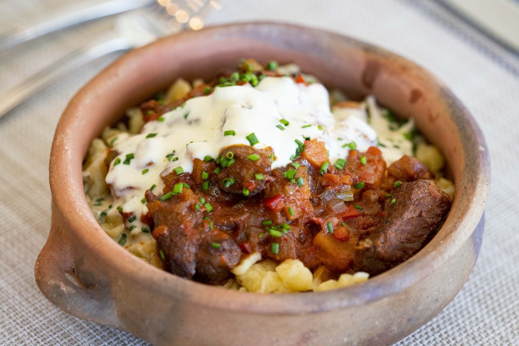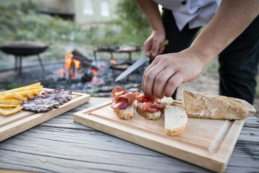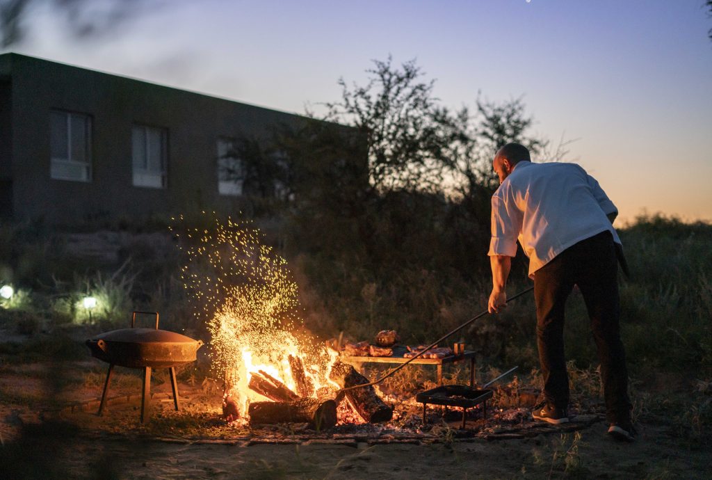 El plan es probarla en un templo pagano, en amable ceremonia. A los pies del lodge, un círculo de sillas que miran a otro círculo más pequeño de piedras en cuyo centro se clava solemne una estaca, allí el chef asa costillares, pero también corderos. El tiempo se detiene y prolonga la felicidad, la espera se aquieta con embutidos y quesos de los pueblos vecinos. Contemplar el fuego de esta manera, con la promesa de luego sentarse en una única y larga mesa, es una epifanía. “Queremos llevar la mesa al campo”, sugiere el joven Remigio. El menú se amplía a platos de olla. Guisos fundantes de largas sobremesas. También carne estacionada.