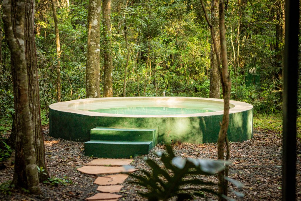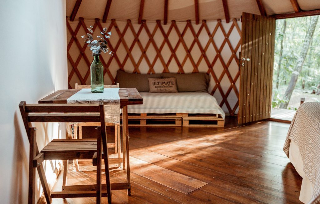No hay sonidos que refieran a la civilización. Un camino secreto se camufla entre el guatambú, el ybira-pitá, timbó, las palmeras y el uranday. Cuatro yurtas aisladas atraen la atención, son hechas según diseños de las tribus nómades de Mongolia. La simpleza corona la propuesta: experimentar el glamping, el camping con glamour, cada yurta cuenta con pileta privada, hamaca paraguaya, muebles de exterior, un fogón y una parrilla.