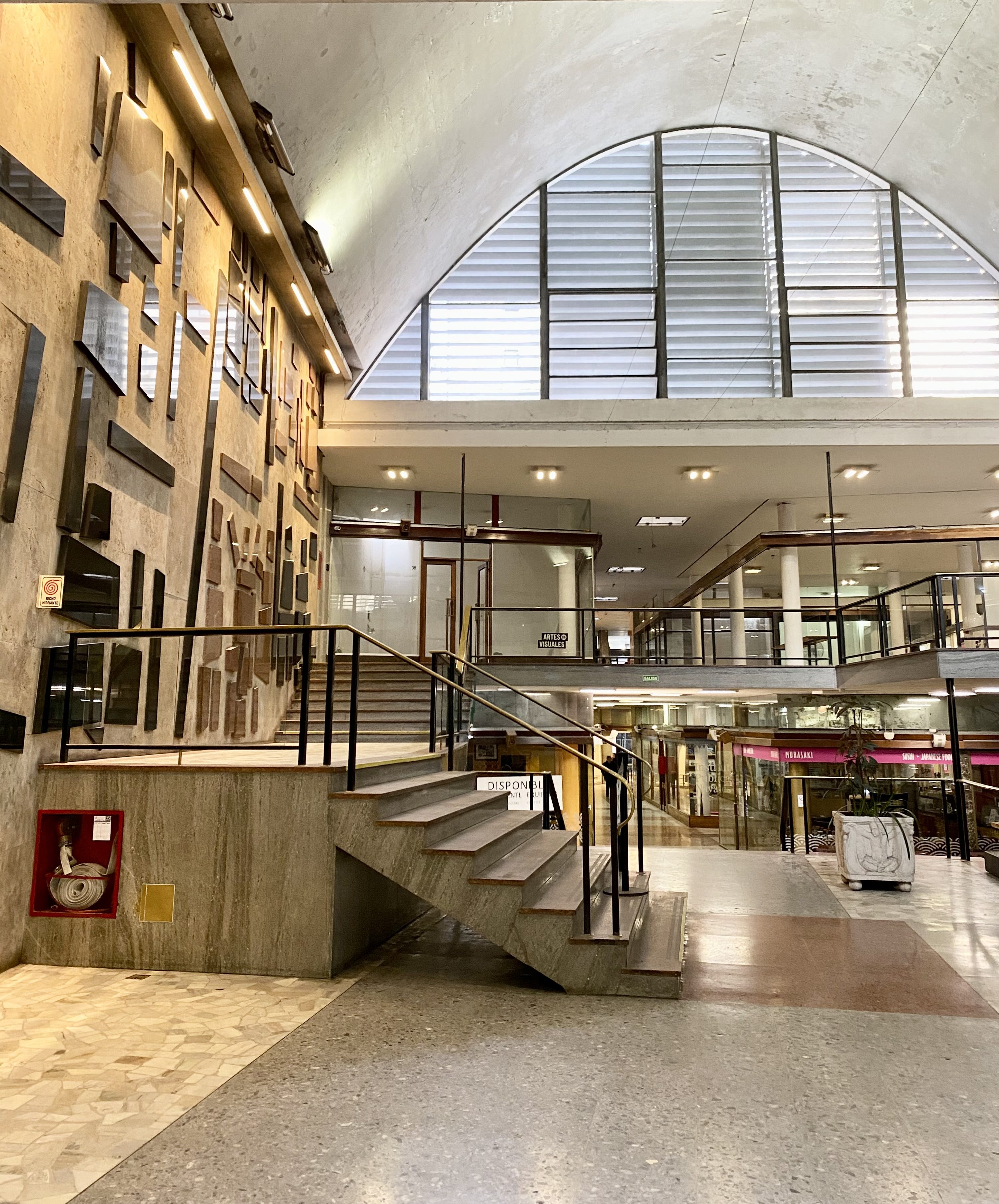 AFFAIR va a ocupar el entrepiso de las galerías, que ya había sido vaciado hace tiempo con el objetivo de armar un espacio cultural, y que en este momento está en plena obra. “Lo fueron probando con algunas acciones que hicieron junto al Gobierno de la Ciudad para reactivar el Microcentro, eso fue un piloto. Después aparecimos nosotros con este proyecto que cuadraba y acá estamos”, cuenta Oli Martínez de TokonOMa, a MALEVA. Los ventanales abovedados en altura, el gran mural de Luis Seoane circundando la escalera principal, fotos míticas del Microcentro en blanco y negro, las mesas de un restaurante japonés en medio del salón central; hay algo magnético en la energía nostálgica del lugar.