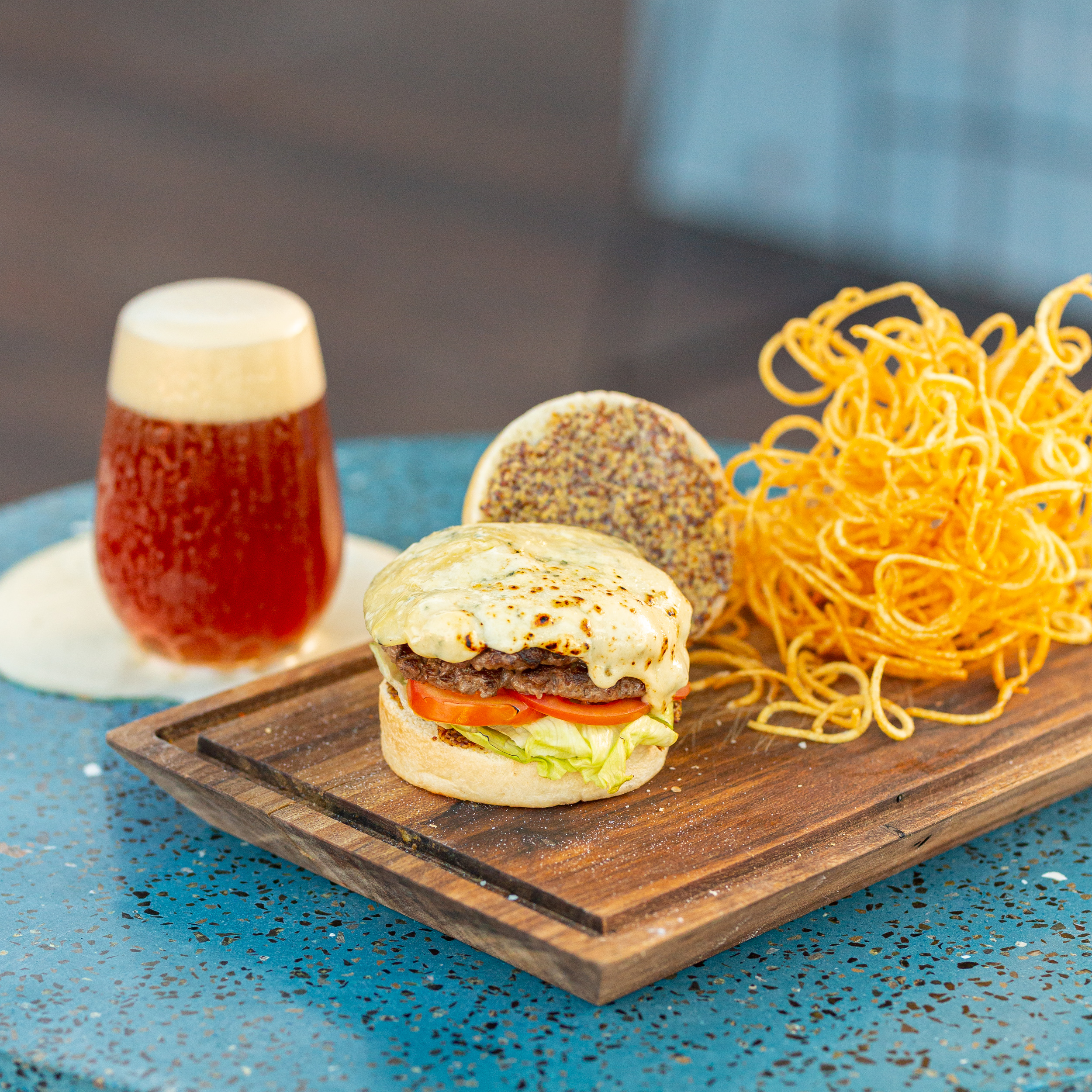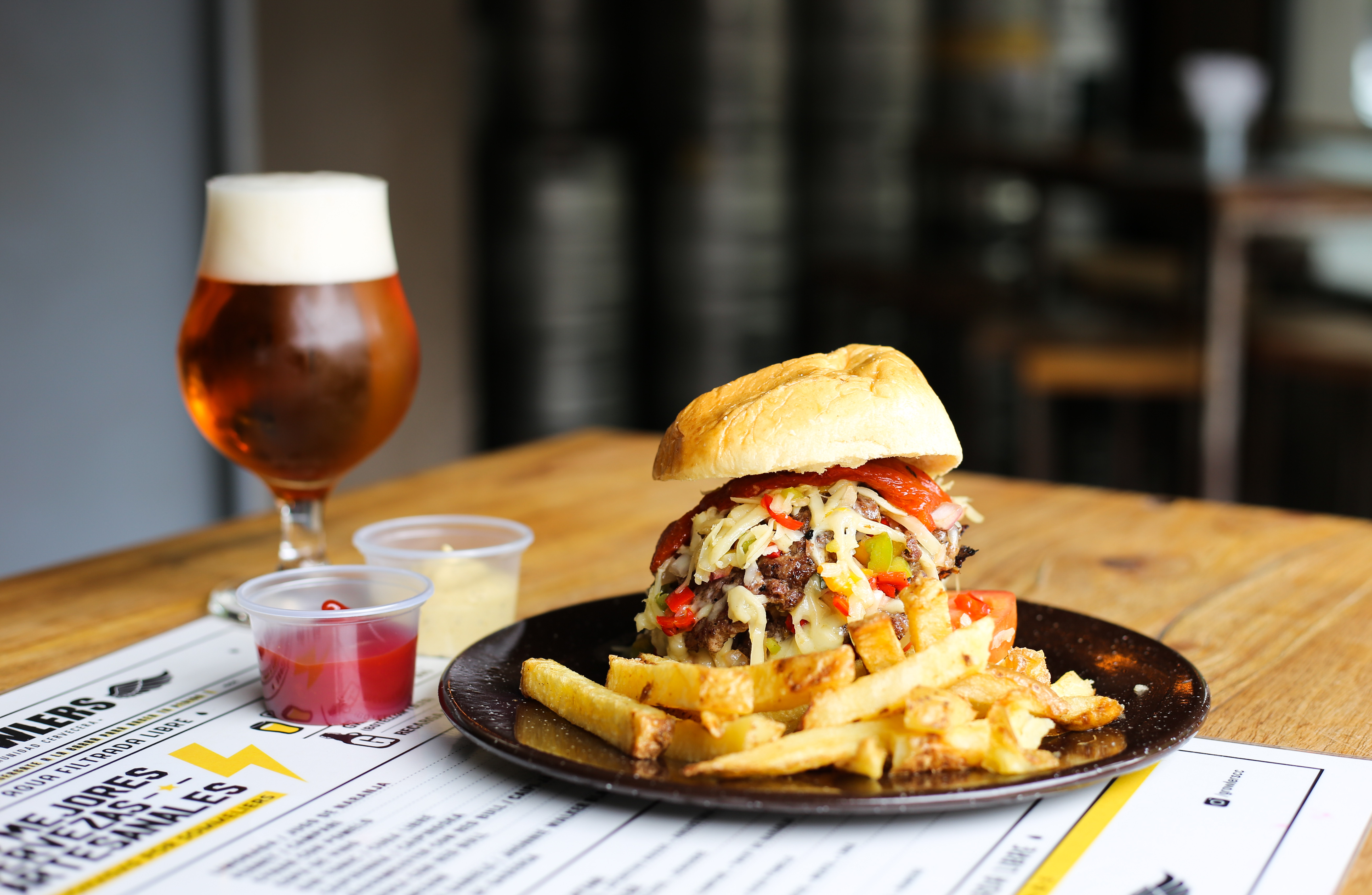 Para acompañar su amplia propuesta de cervezas artesanales (con entre 30 y 40 canillas en sus tres sucursales), Growlers incluyó en su carta una Doble Provo Burger que es una bomba: tiene doble ración de provoleta grillada, dos smashed burgers (cocidas con una técnica que garantiza mejor textura y sabor), pimientos ahumados, tomate, lechuga capuchina, salsa criolla y se sirve entre panes de queso parmesano, acompañada de papas fritas. Desde la casa, sugieren maridarla con una cerveza Blonde o de Trigo.