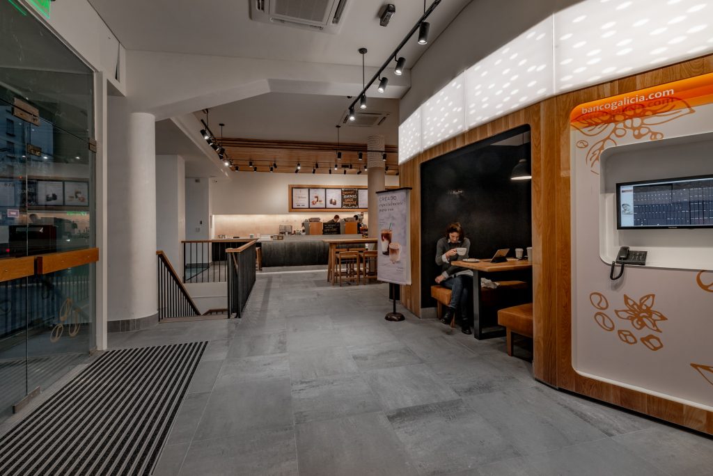 El Galicia busca que las sucursales se transformen en espacios de asesoramiento. Esto, sumado a procesos digitales y sin papel, hace que los espacios sean minimalistas desde el diseño y no tan rígidos como las sucursales tradicionales a las que estamos acostumbrados, con muchos espacios para sentarse que hacen que las conversaciones con un ejecutivo sean más relajadas. Todo con el tentador aroma de fondo de un roll de canela que se calienta en el horno.