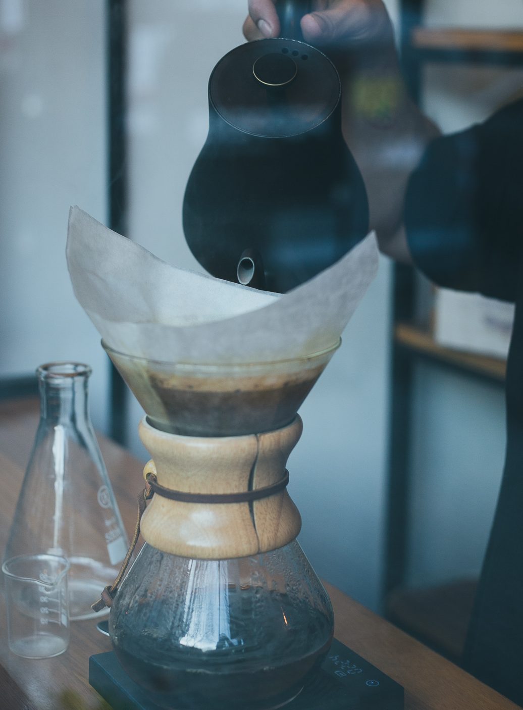 Mientras me preparaba un café en la Chemex, Diego, el barista, me contaba la peculiaridad de este método: se usa un filtro más grueso que en las más modernas, por eso resulta en un café más clarito, limpio, ligero y aromático. Puede que sea la mejor puerta de entrada a los filtrados para los que no están acostumbrados a tomar café solo, porque tiene una semejanza al té.