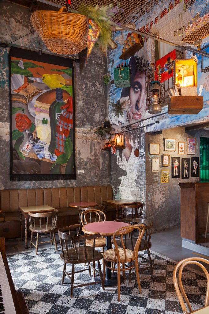 El bar tiene el pintoresco espíritu de viejo almacén de barrio: estanterías con productos de marcas nacionales e icónicas que han marcado la adolescencia de muchos (como las mielcitas); yerba, cajones con sifones de soda, un piano antiguo y piso damero. De fondo siempre suena música nacional: a veces toca rock y otras cumbia. Mientras que los domingos suelen organizar eventos con sello bien argentino como el Festival Regional del sándwich de miga (en donde se eligió el preferido entre las principales confiterías de Buenos Aires), el reinado de la medialuna e incluso torneos de ajedrez. “Se genera un punto de encuentro con públicos de diferentes edades que vuelven a disfrutar de esos rituales en familia o con amigos”, asegura Ortiz.