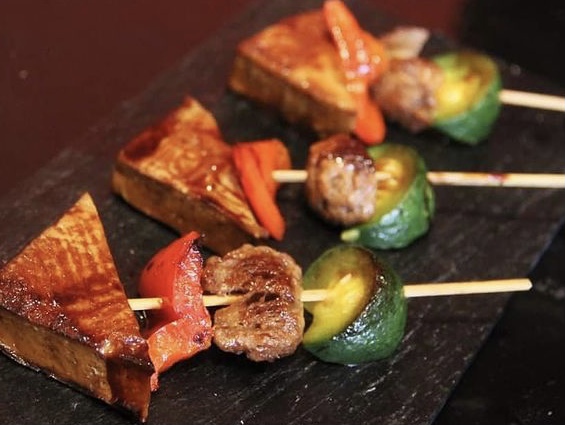Para la entrada ofrecen un yakitori mix (langostinos con salsa red miso, bolas de pollo conocidas como tsukune, con salsa teriyaki y shiitake mushrooms con salsa kabayaki) o un oniguiri (bolas de arroz con salmón, mayo de wasabi, nori y sichimi togarashi).