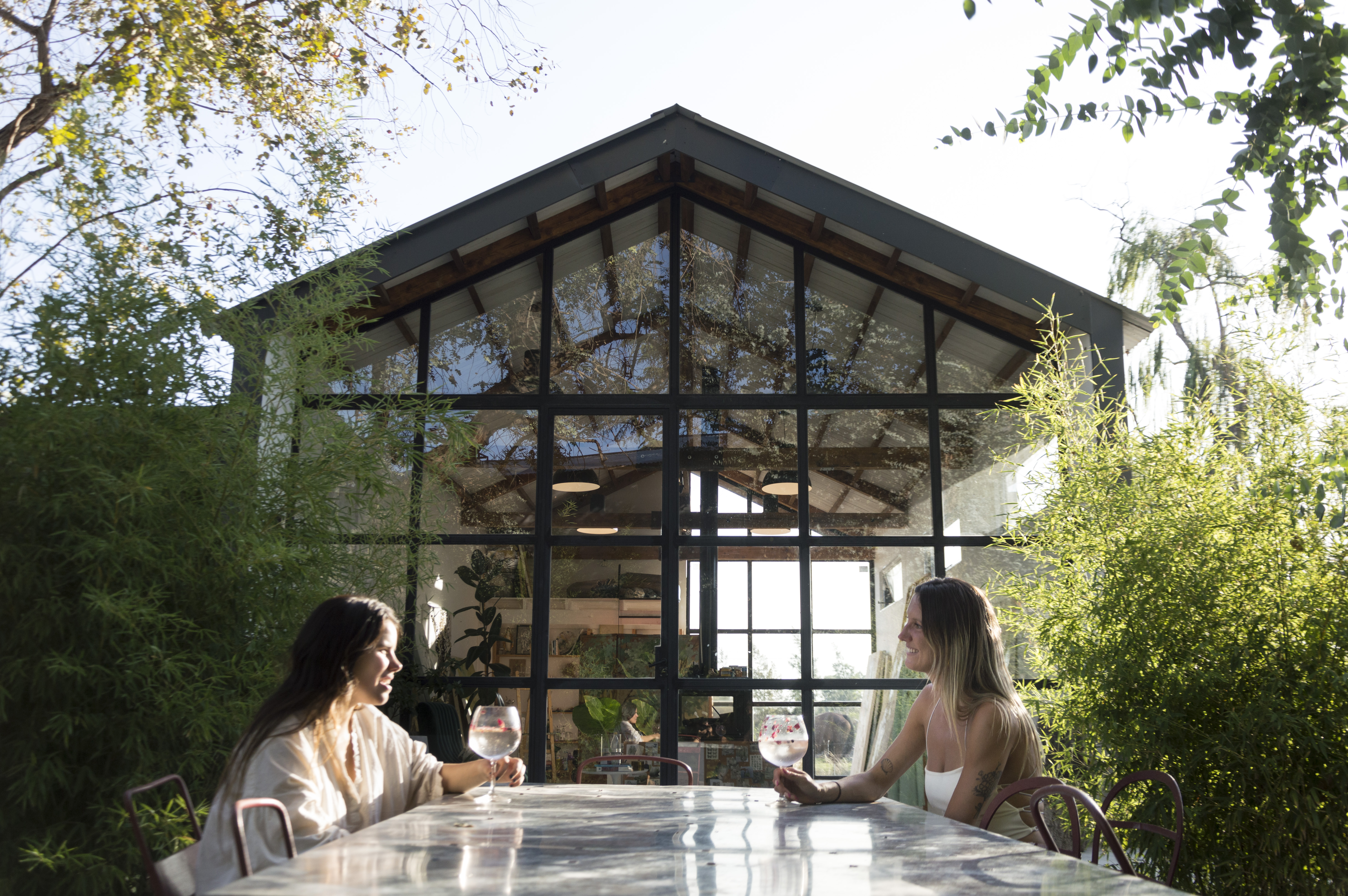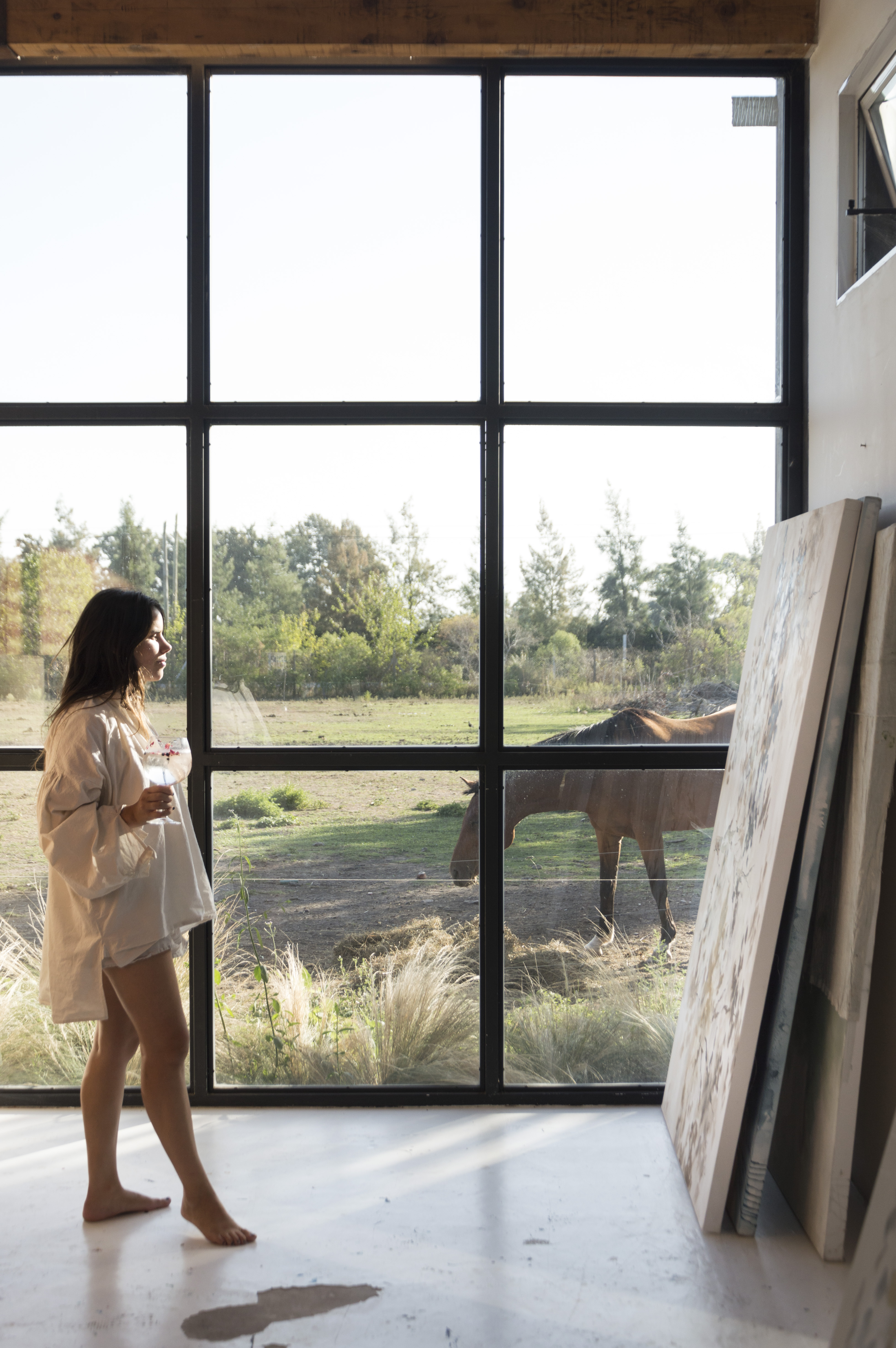 En el interior de Pilar, camino de tierra hacia adentro, en una zona de campo donde los caballos caminan con tranquilidad y libertad, descansa el atelier de Catalina Ruiz – @catalinapinturas -. Detrás de su casa de familia, te recibe una construcción rectangular simple, con ventanales inmensos en dos de sus paredes y un techo de chapa a dos aguas, rodeada de verde, de flores, y rincones escondidos de descanso y contemplación. Su taller es su oasis, el espacio donde sucede aquel trance inexplicable que la ayuda a volcarse completamente en sus cuadros. Se construyó en el 2020, y fue su refugio pandémico, aquel que la inspiró a pintar 368 cuadros (sí, más de uno por día) y la terminó de disparar como artista.