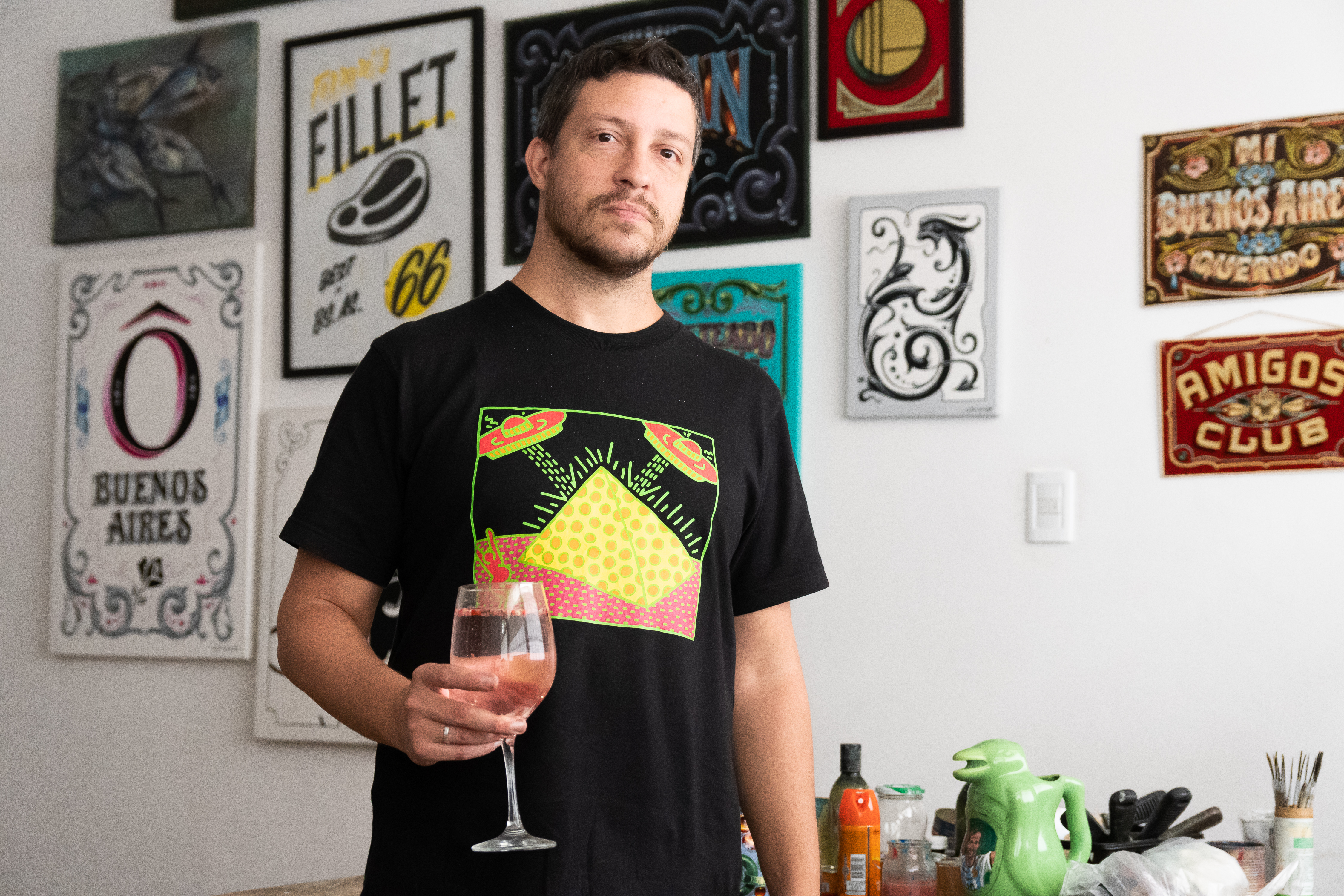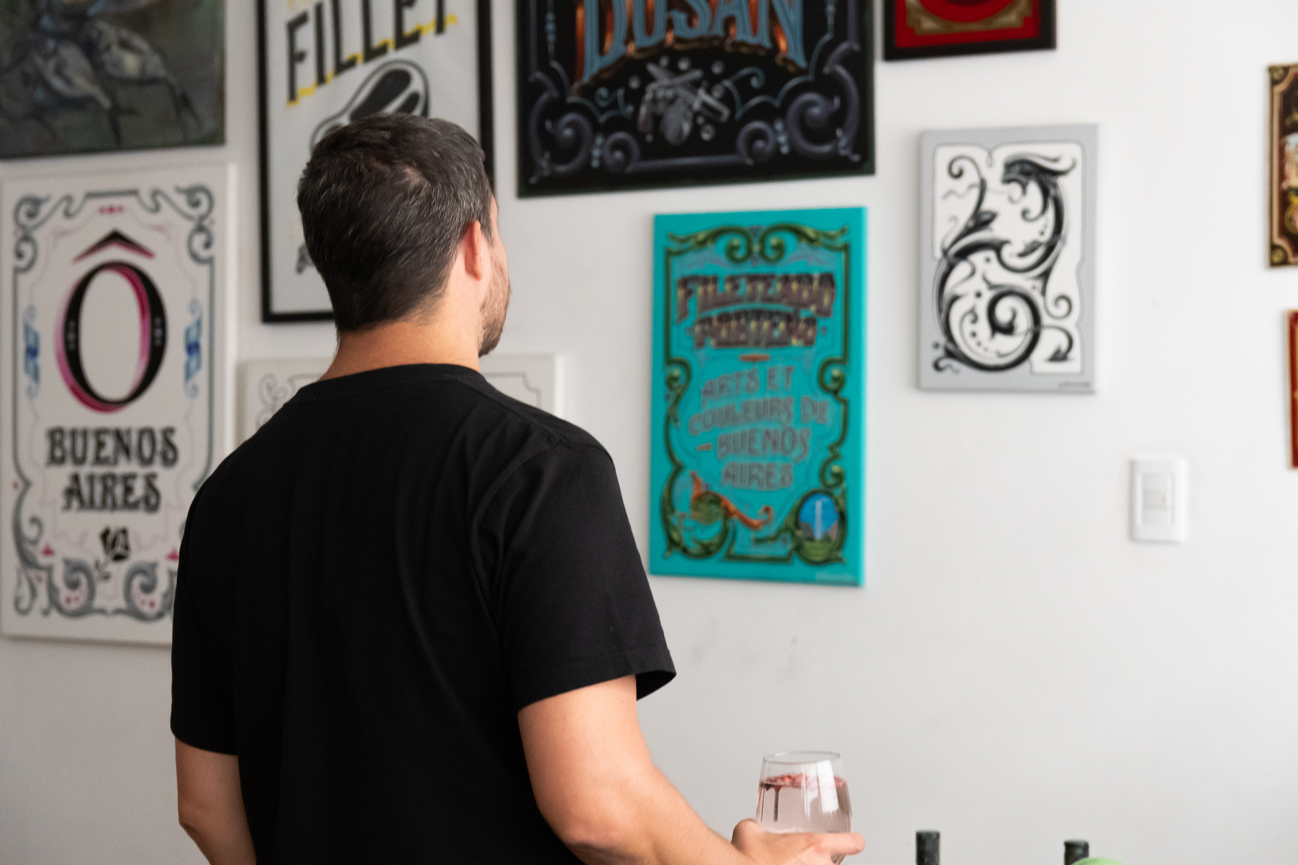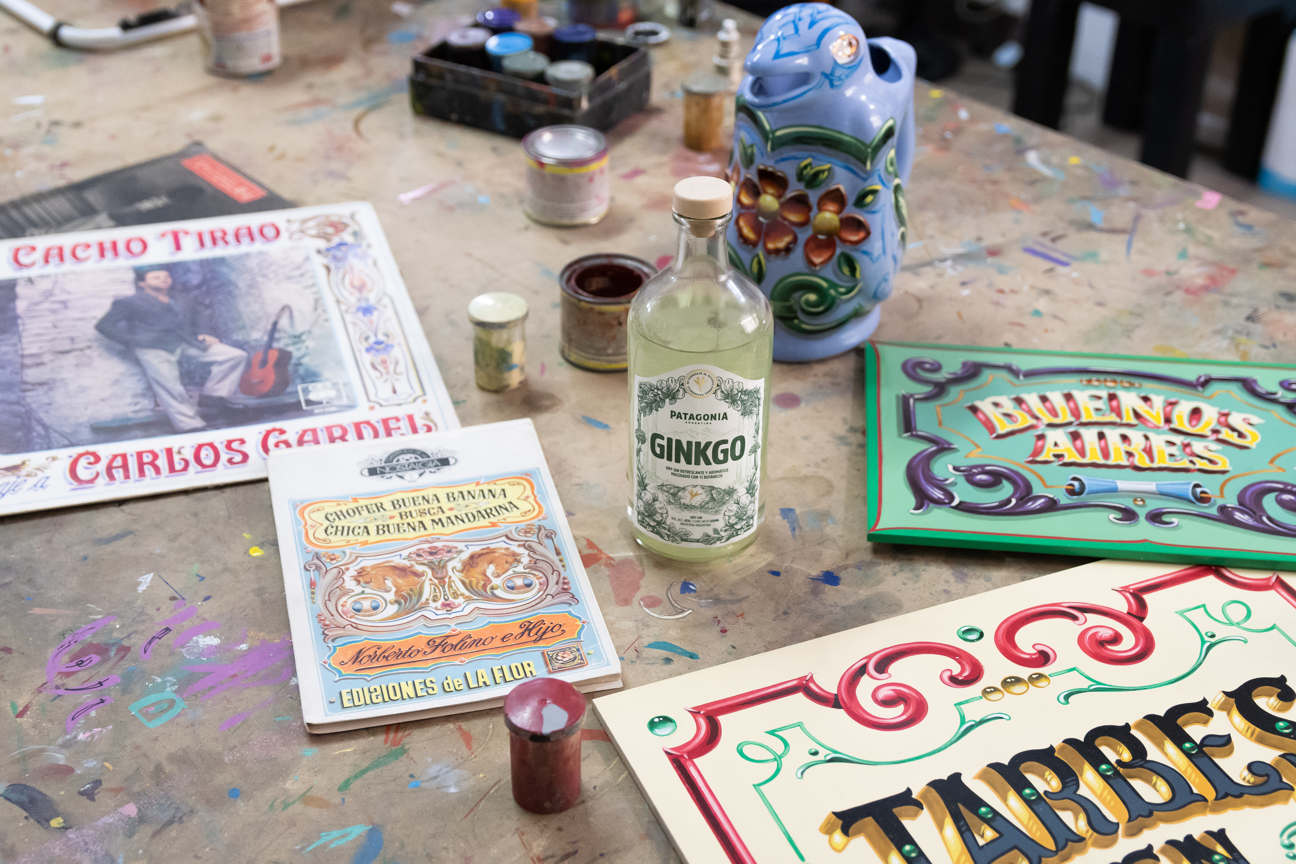 Así, fascinada e intrigada, me senté con el artista que lleva 23 años haciendo fileteado – con copas del gin de Patagonia Ginkgo y tónica de por medio – para que me cuente sobre esta técnica que siento tan propia y de la que a la vez conozco muy poco. Cómo lo flechó al punto de transformarlo de potencial historiador a fileteador, y el rol que tiene hoy de perpetuar – y a su vez actualizar – este arte tan cultural.